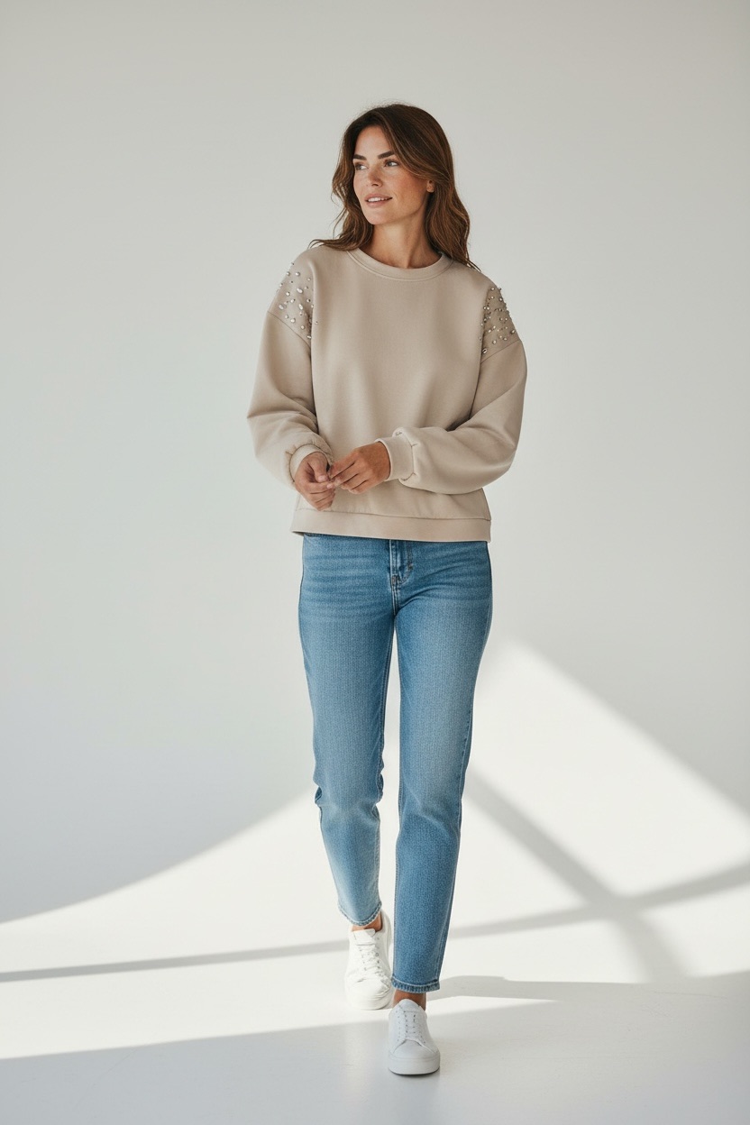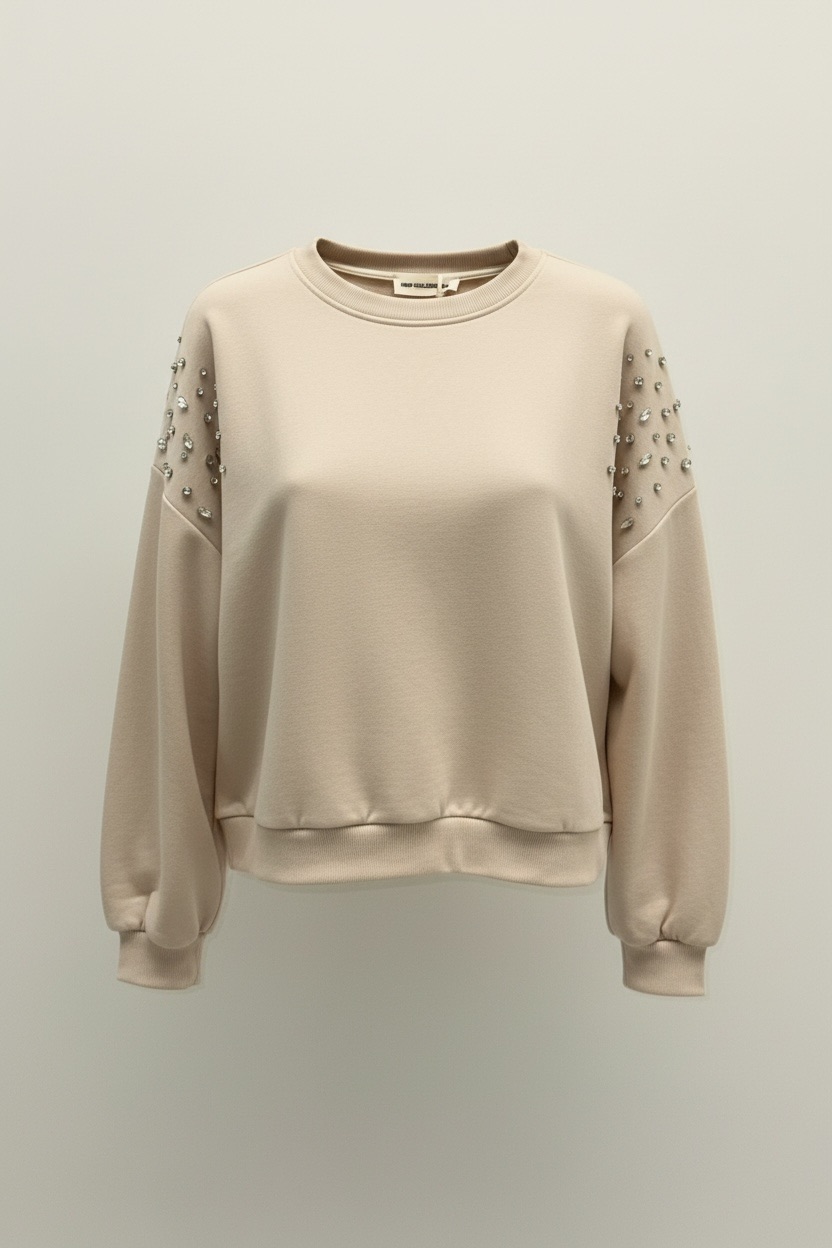 Son design oversize, très tendance cette saison, assure un tombé fluide et flatteur pour toutes les morphologies. La particularité de ce modèle réside dans ses détails en strass délicatement appliqués sur les épaules, apportant une touche lumineuse et sophistiquée qui élève instantanément le look. C’est un sweat casual, mais avec un vrai twist mode : simple, confortable, et pourtant résolument chic.
