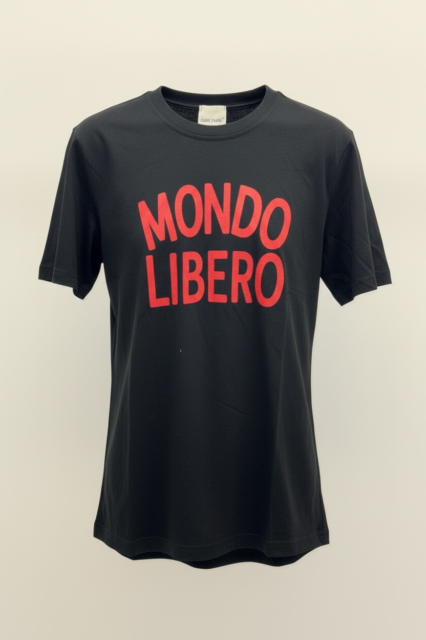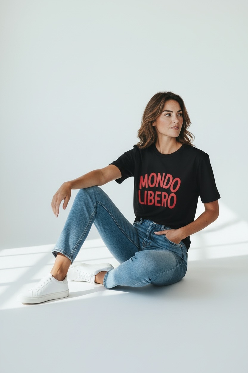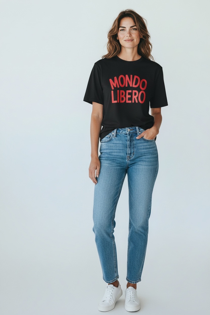 Ce t-shirt à épaulettes revisite le basique avec une vraie identité mode. Son message “MONDO LIBERO” imprimé en contraste apporte une touche forte et affirmée, idéale pour attirer l’œil en boutique comme en ligne. C’est une pièce à caractère, pensée pour les clientes qui aiment les looks simples mais impactants.