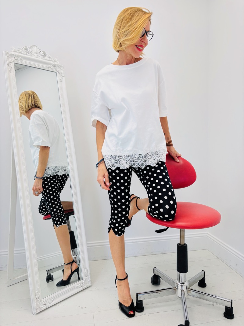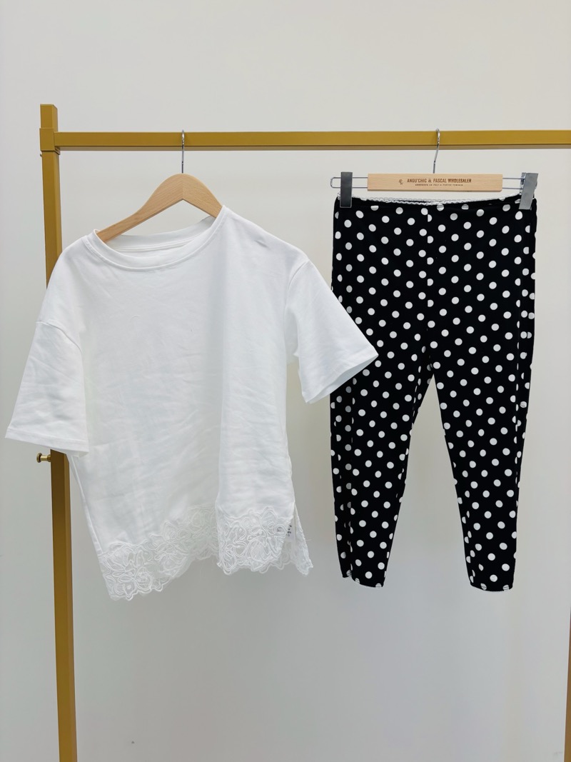 Découvrez notre T-shirt blanc orné de dentelle, parfait pour ajouter une touche d’élégance à votre garde-robe. Ce modèle allie confort et style avec sa matière 100% coton.