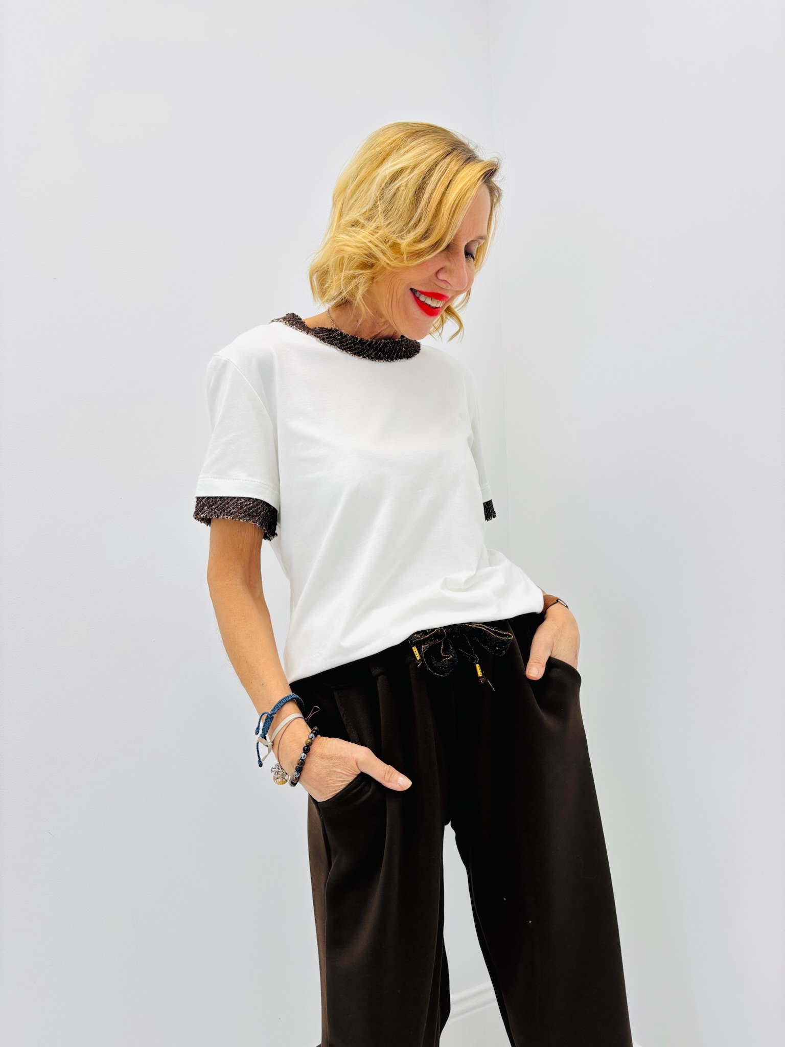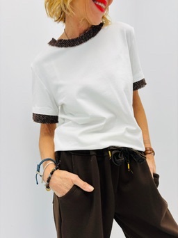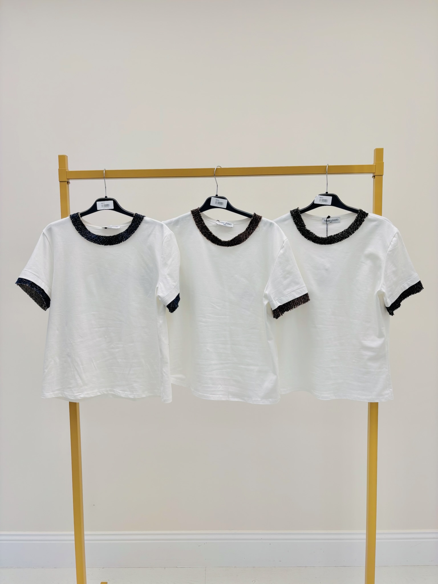 Sa base blanche en 95% coton assure confort et respirabilité, tandis que les finitions scintillantes au col et aux manches apportent une touche lumineuse et moderne.