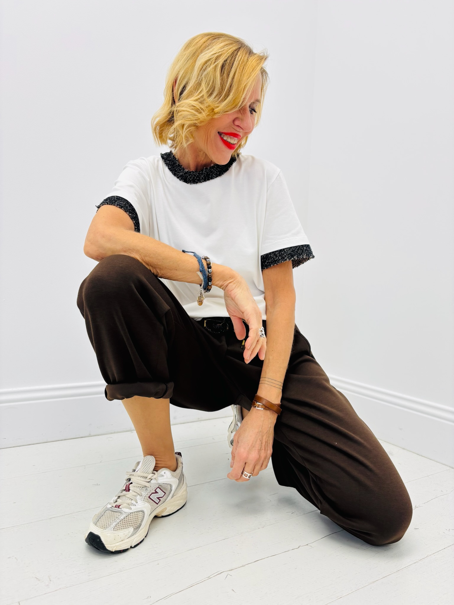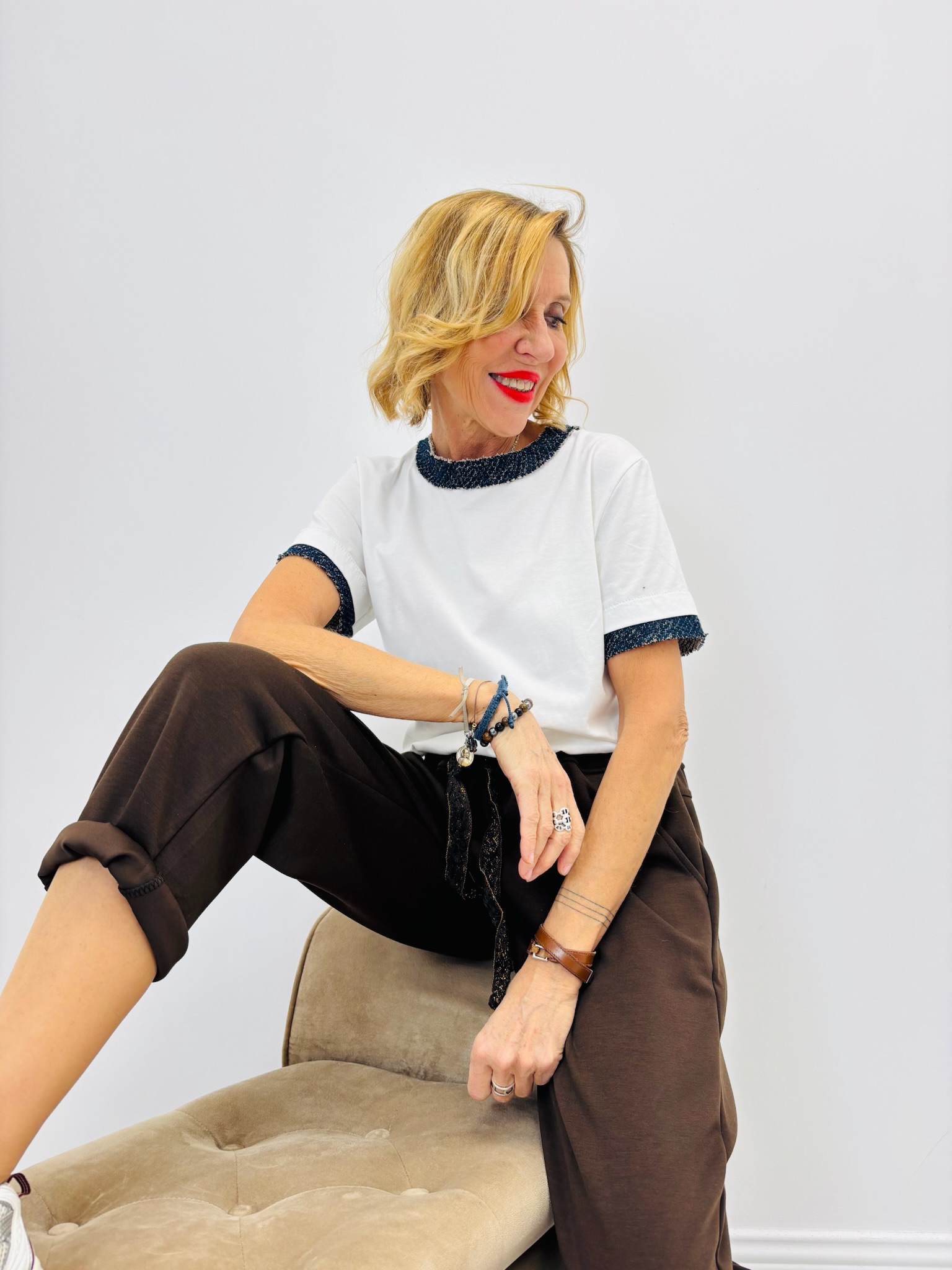Le contraste entre la matière mate du coton et la brillance du lurex lui donne un air sophistiqué sans en faire trop — idéal sous un blazer ou un gilet.