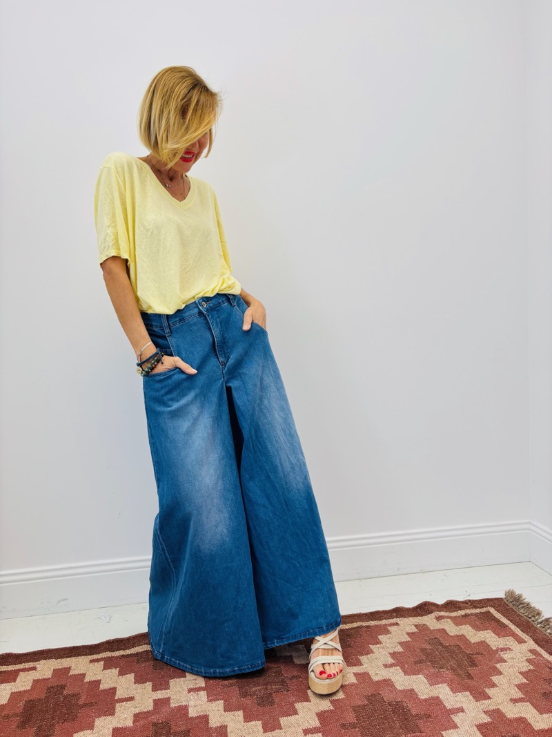 Porté rentré dans un jean wide leg, un pantalon fluide ou un short taille haute, il crée un look effortless chic. Il fonctionne aussi parfaitement avec une veste matelassée légère ou un blazer pour un contraste casual / structuré.