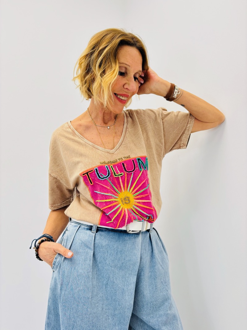 Le design se distingue par un magnifique patch brodé multicolore représentant un soleil rayonnant accompagné de l’inscription “Tulum Is Sunny”. Les fils colorés créent un relief graphique et vibrant qui attire immédiatement le regard et donne à la pièce une véritable identité mode.