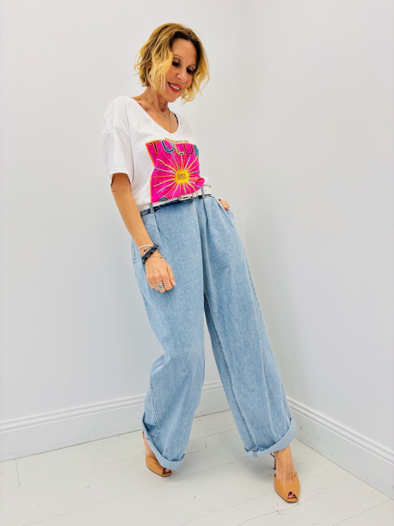 Ce t-shirt se porte facilement avec un jean taille haute, un short en denim ou un pantalon fluide pour créer une silhouette casual estivale. Son visuel coloré apporte immédiatement une touche dynamique et ensoleillée à la tenue.