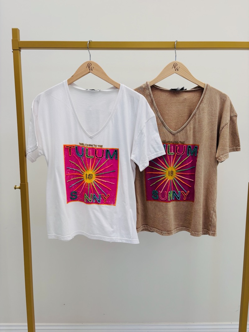 Ce t-shirt au style solaire et coloré capture parfaitement l’esprit des destinations estivales. Avec son visuel vibrant “Tulum Is Sunny”, il évoque une ambiance de vacances, de soleil et de liberté. Cette pièce apporte une touche positive et lumineuse à une collection printemps-été.