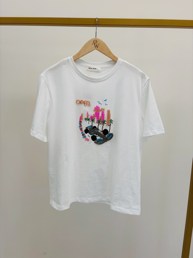Un t-shirt casual chic revisité avec une touche artistique et originale. Ce modèle se distingue par son motif brodé coloré inspiré d’un paysage urbain, mêlant perles, broderies et détails texturés pour un rendu unique et tendance.