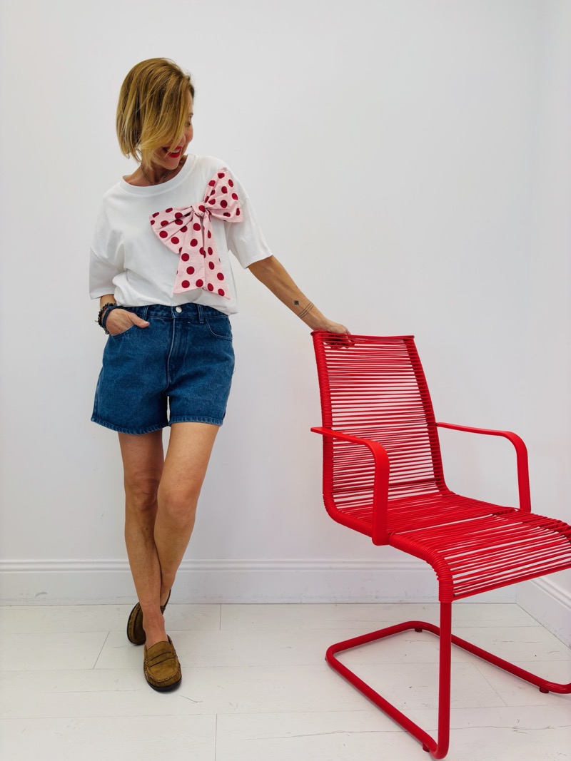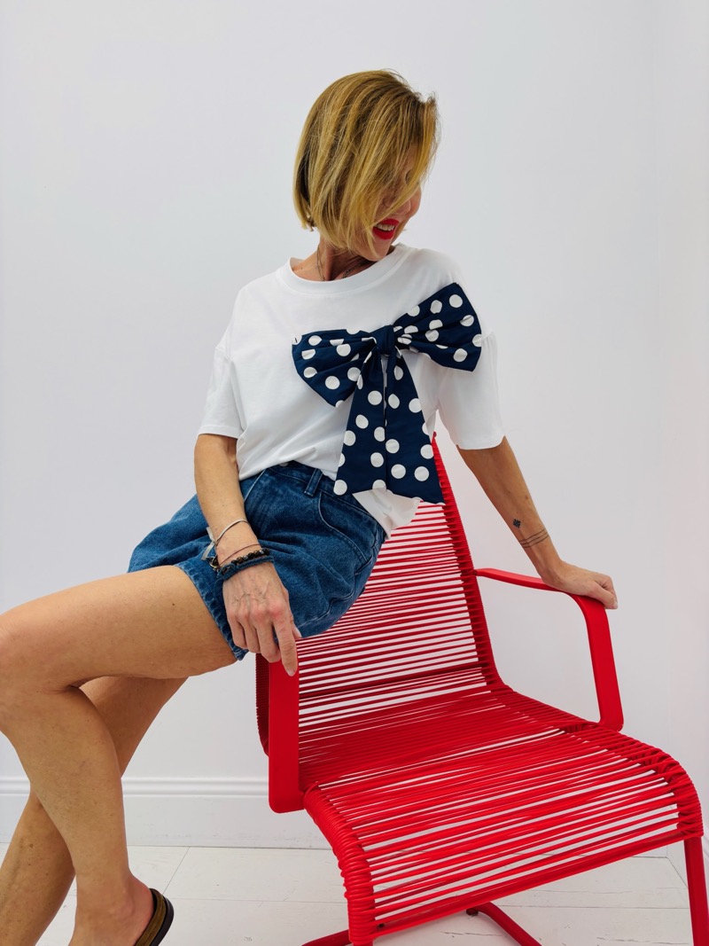 Ce t-shirt revisite un basique incontournable avec une touche ludique et féminine. Son design épuré en coton blanc est sublimé par un grand nœud à pois contrasté, apportant une note originale et tendance qui attire immédiatement le regard.