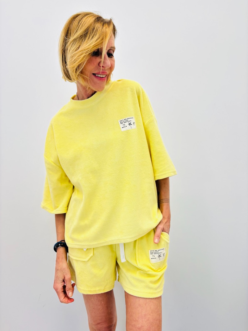 Sa coupe oversize légèrement courte offre un tombé tendance et décontracté, parfait pour un look actuel. Le tissu éponge, doux et absorbant, garantit un confort optimal tout au long de la journée, idéal pour la saison printemps/été.