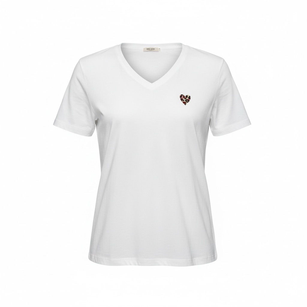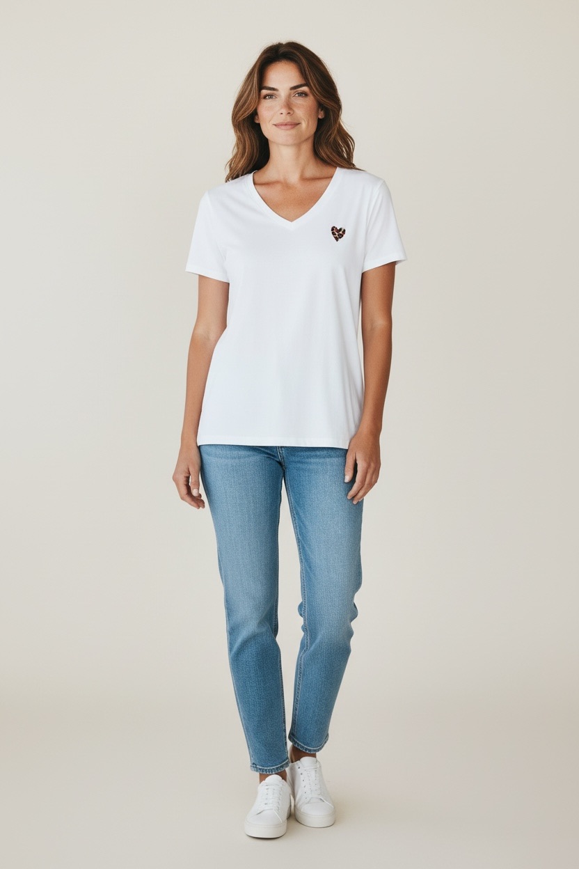 Ce t-shirt femme en coton col V est un basique revisité, pensé pour apporter une touche de féminité et de caractère à une silhouette du quotidien. À la fois simple, élégant et facile à porter, il se distingue par son détail brodé en forme de cœur à motif léopard, discret mais résolument tendance, qui transforme un essentiel en véritable pièce coup de cœur.