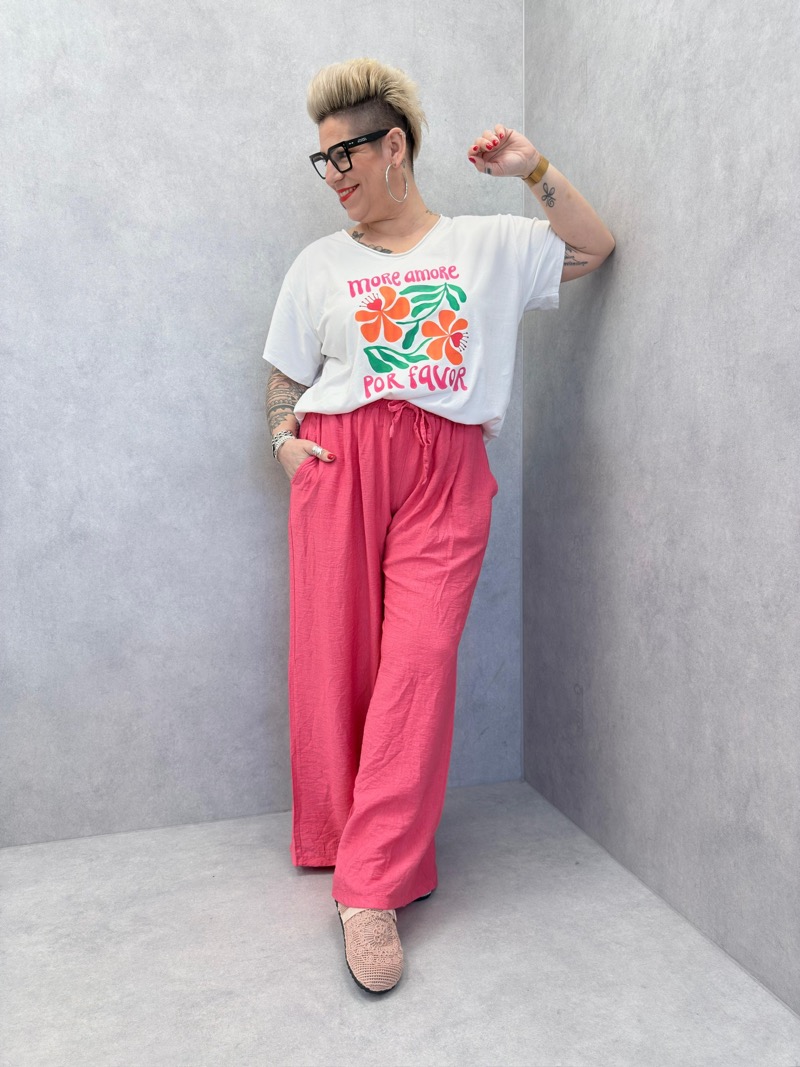 Ce t-shirt décontracté arbore un motif floral vibrant avec l’inscription ‘More Amore’. Idéal pour ajouter une touche de couleur et de style à votre garde-robe quotidienne.