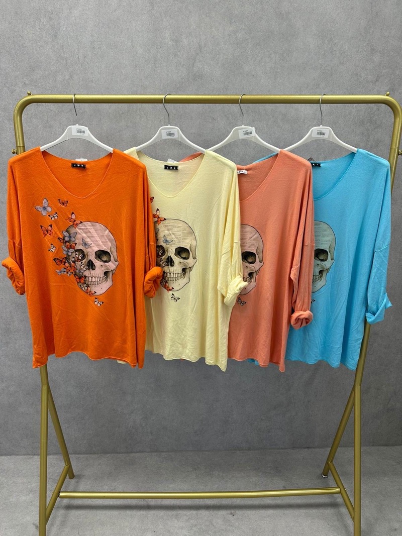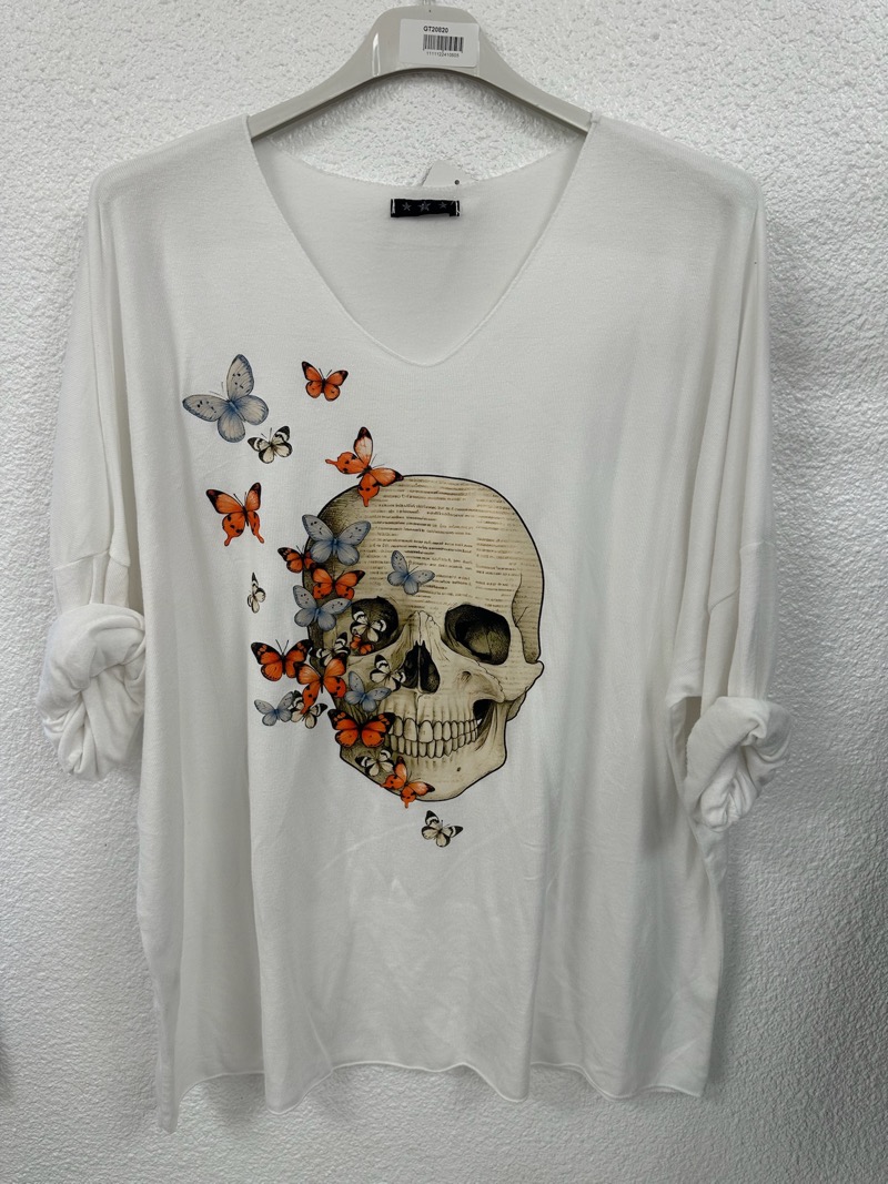 L’élément central de ce t-shirt est son imprimé crâne artistique accompagné de papillons, créant un contraste subtil entre esprit rock et touche poétique. Le motif, travaillé avec finesse, apporte une vraie valeur ajoutée au produit et transforme un simple t-shirt en pièce mode à part entière. Les manches 3/4 avec patte de maintien permettent de moduler le style selon l’envie, pour un look plus structuré ou plus casual.
