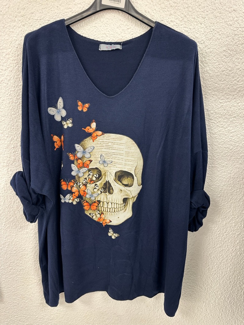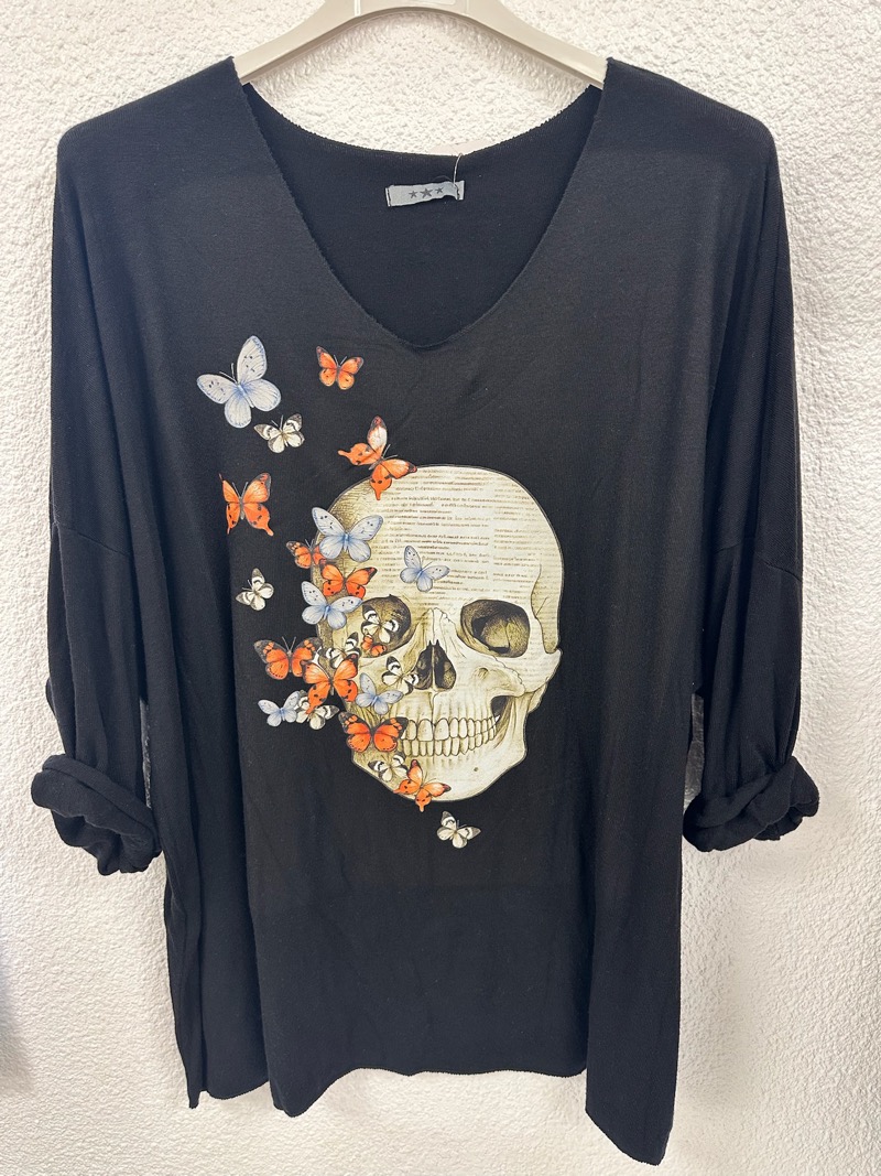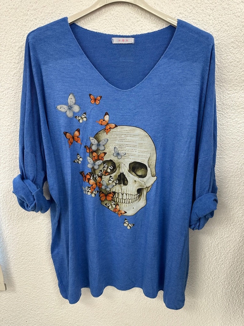 T-shirt fluide col V imprimé artistique crâne & papillons – Grande taille