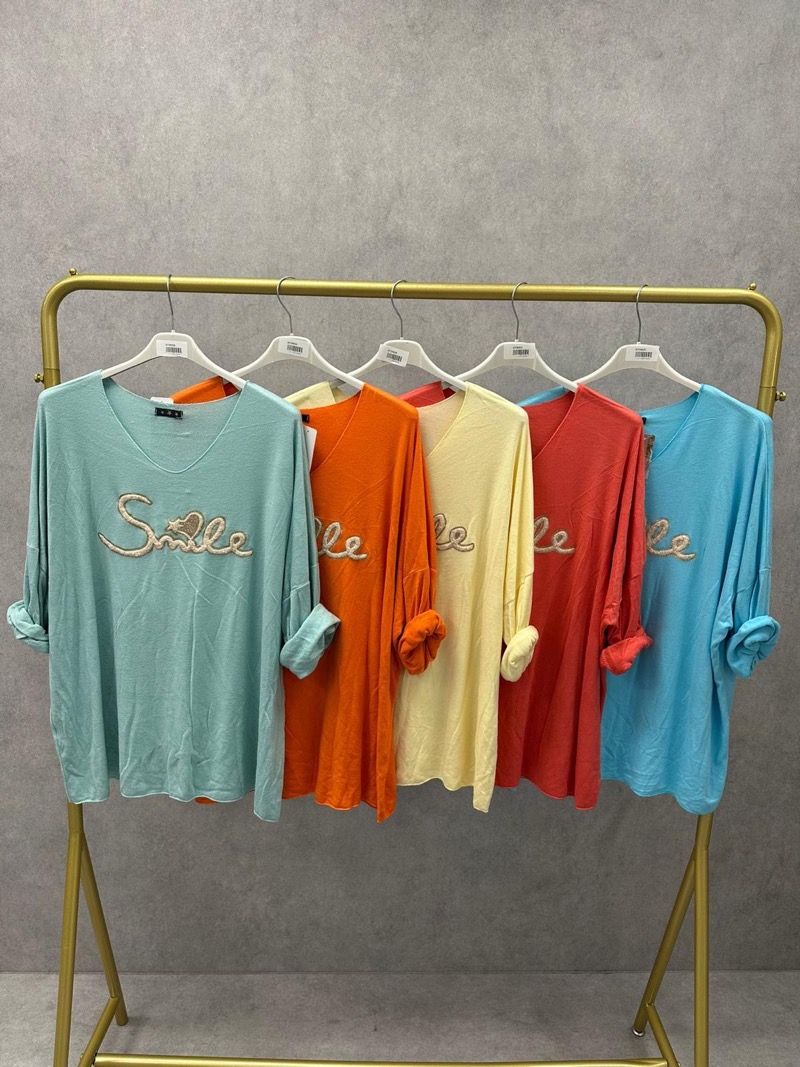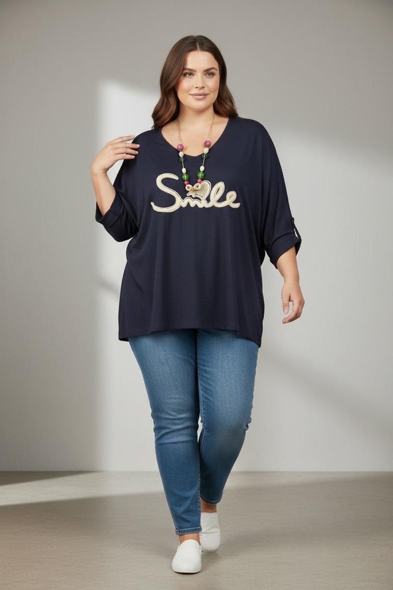 Ce t-shirt fluide col V avec message brodé “Smile” est une pièce à la fois confortable, tendance et positive, idéale pour enrichir une collection grande taille moderne. Pensé pour sublimer les silhouettes généreuses, il offre un tombé naturel et léger, parfait pour un usage quotidien tout en restant stylé.