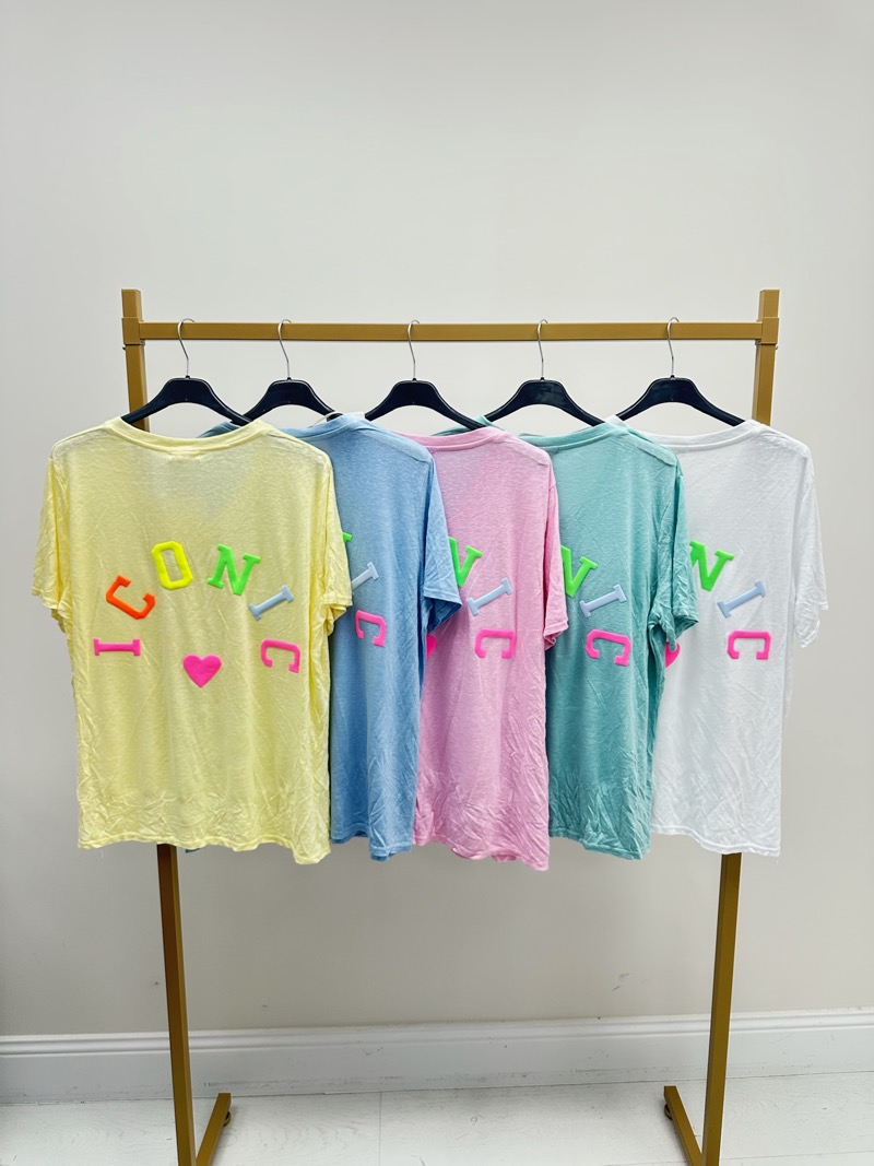Disponible en plusieurs coloris lumineux – jaune pastel, bleu ciel, rose poudré, vert d’eau et blanc – ce modèle s’intègre parfaitement dans une capsule estivale fraîche et tendance. Les teintes douces contrastent avec le message au dos composé de lettres en relief effet gomme, dans des couleurs néon vibrantes (rose, vert, orange, bleu). Le petit cœur central renforce l’esprit fun et féminin du modèle.