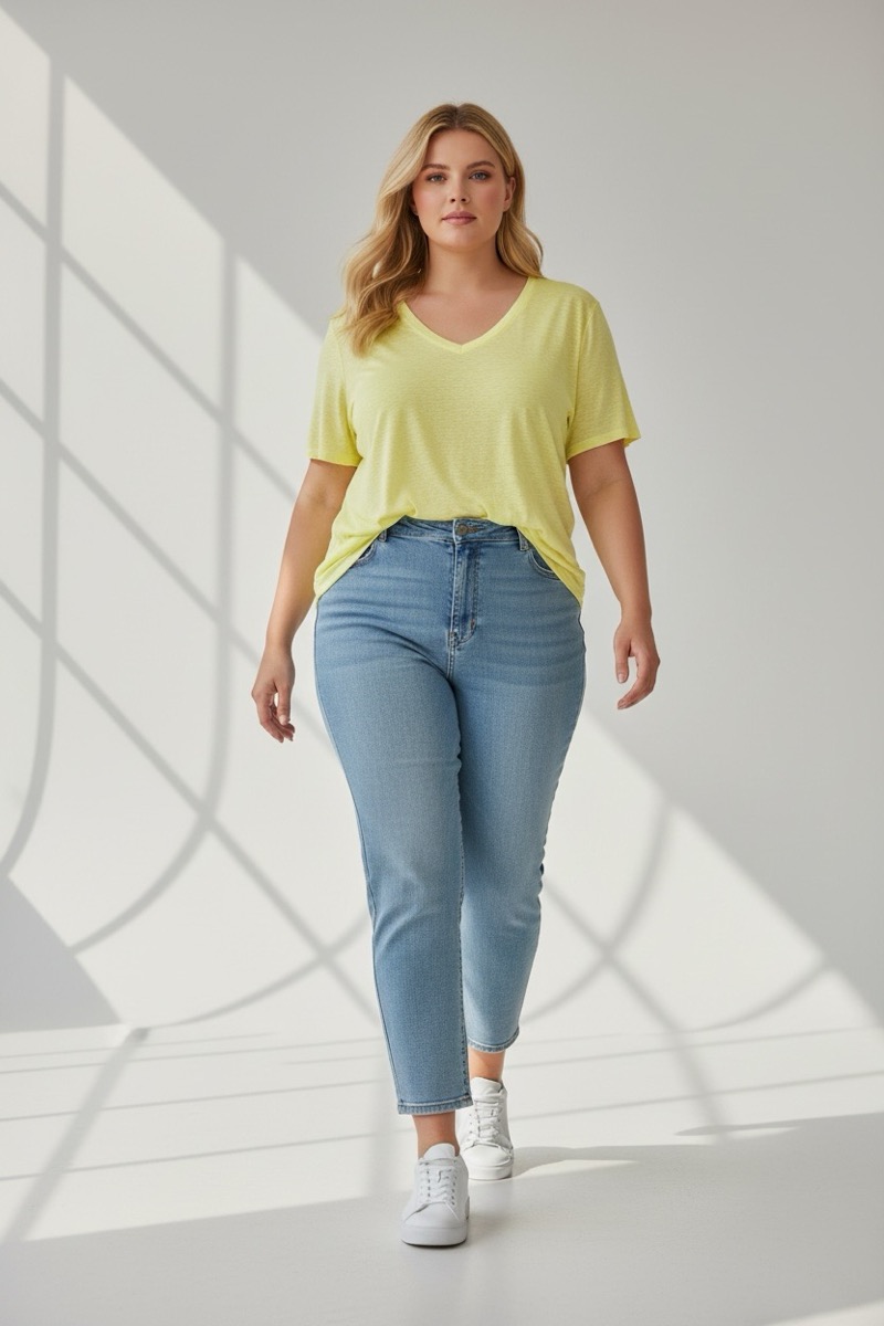 Confectionné dans une matière légère et fluide, ce T-shirt offre un tombé souple particulièrement agréable pour les silhouettes grande taille. La coupe ample assure confort et aisance sans marquer les formes. Le col V féminin allonge visuellement le buste et apporte une touche flatteuse, tandis que les manches courtes garantissent une couvrance confortable.