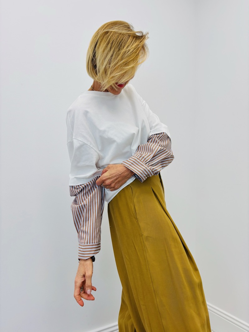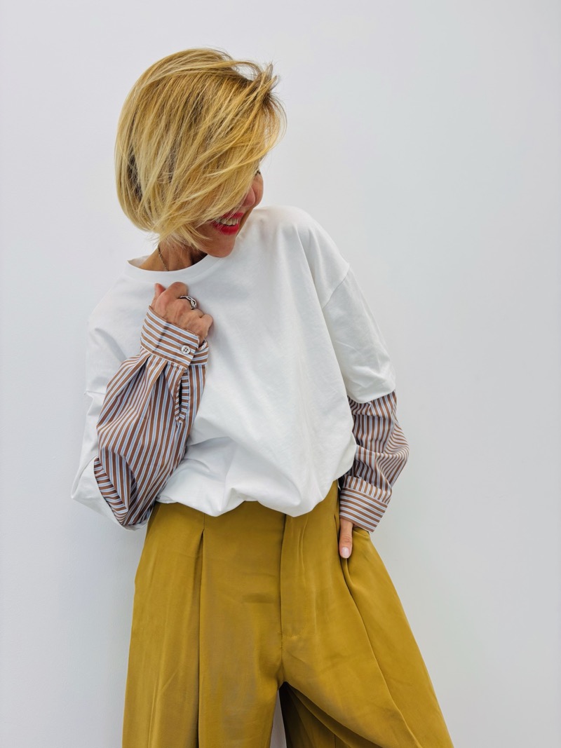 Porté avec une jupe midi pour un look chic décontracté ou associé à un pantalon pour une silhouette plus urbaine, ce t-shirt trompe-l’œil apporte immédiatement du style sans en faire trop. Une pièce facile à vendre, idéale pour créer des looks du quotidien élégants et actuels.