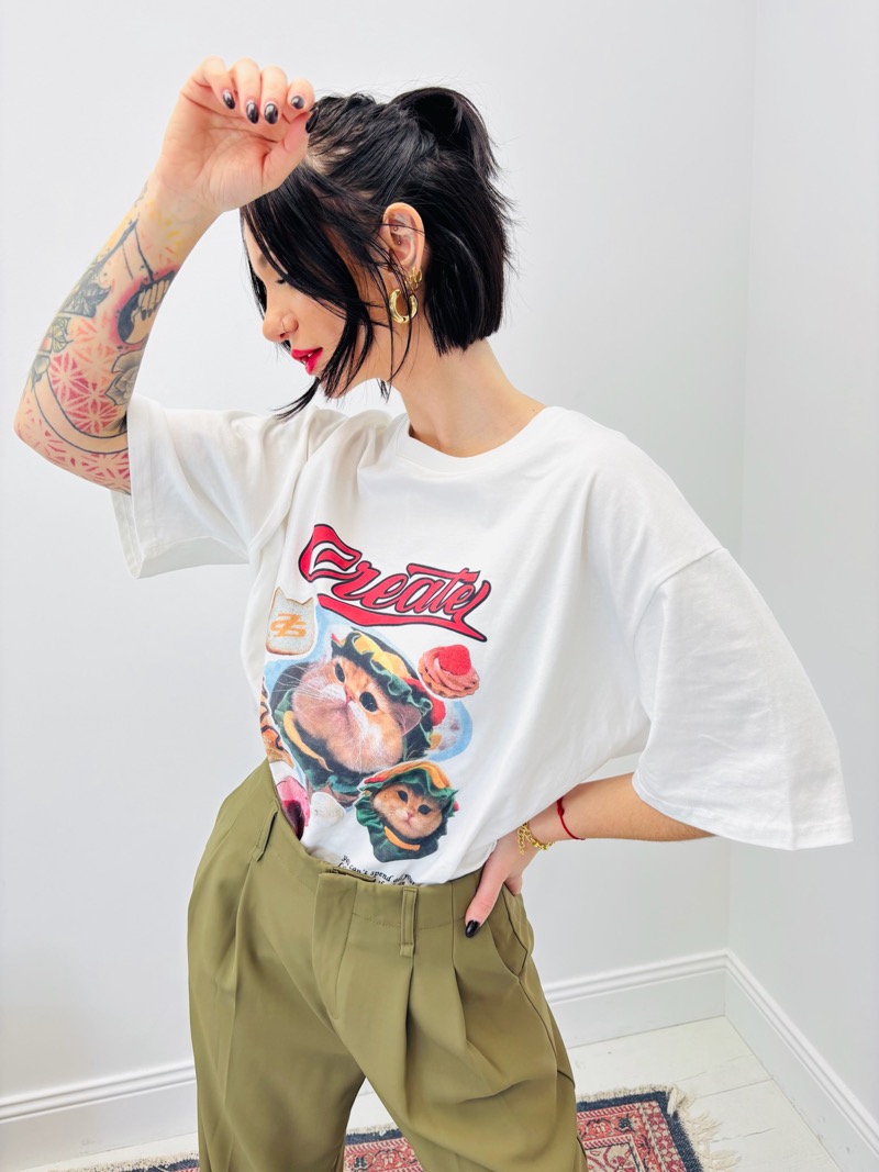 L’imprimé placé sur le devant, riche en détails et en couleurs, donne une identité forte au t-shirt sans en faire trop. Il se marie facilement avec des bas unis et apporte une touche créative à des tenues simples. C’est une pièce idéale pour dynamiser un look et créer un effet “coup de cœur” en rayon.