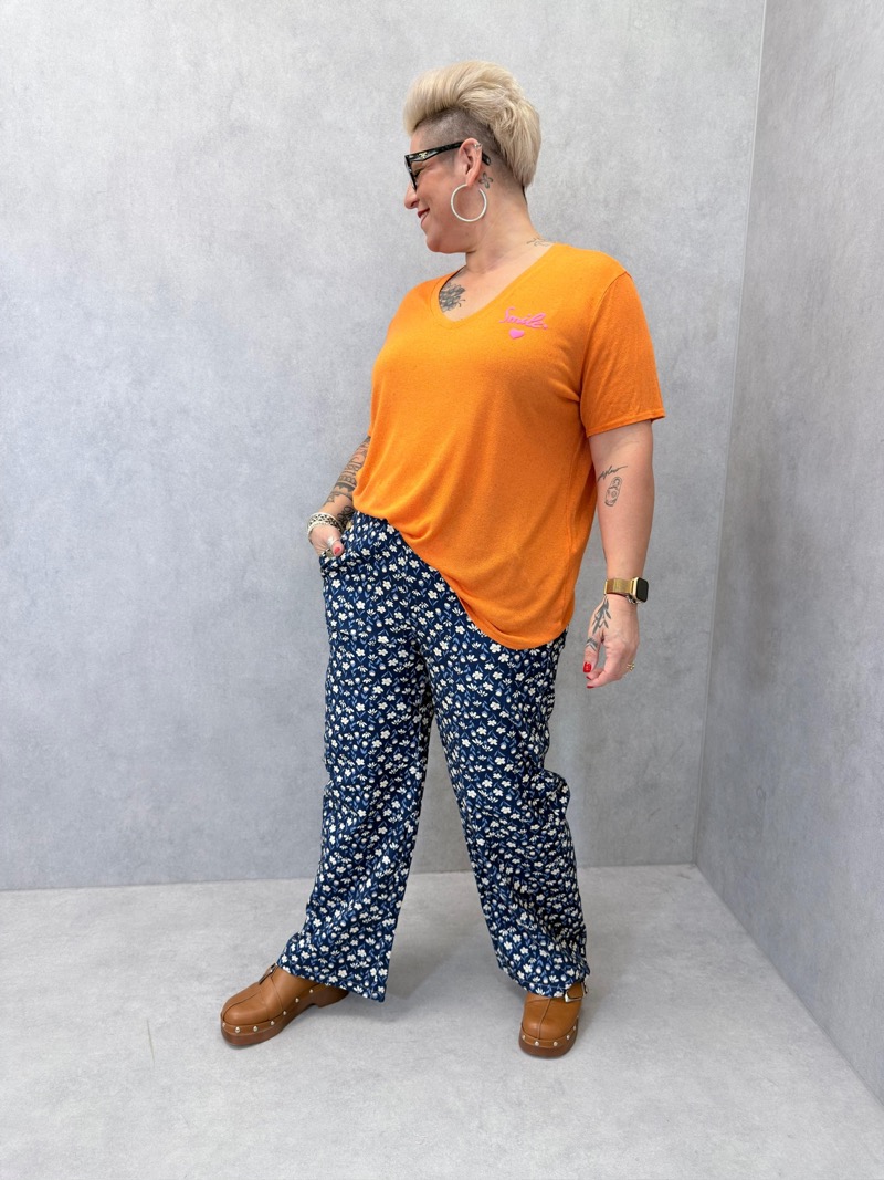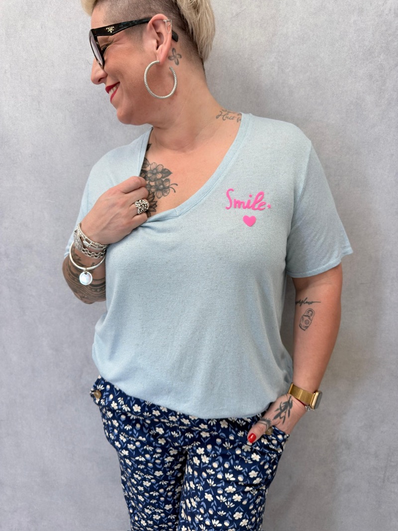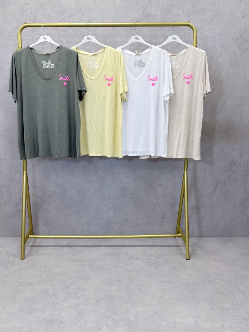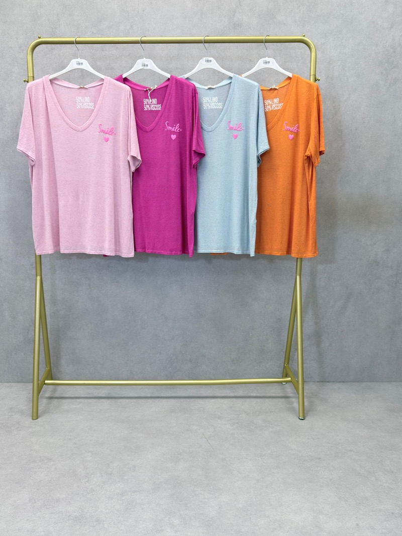 Découvrez notre t-shirt sourire coloré, parfait pour ajouter une touche de gaieté et de confort à votre garde-robe. Conçu dans un mélange de viscose et de lin, ce t-shirt offre une sensation douce et légère sur la peau, idéale pour les journées décontractées.