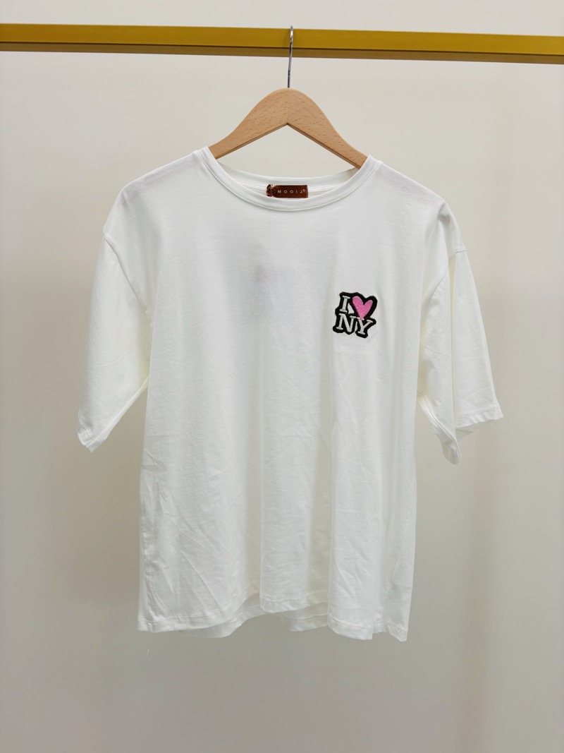 Ce tee-shirt oversize blanc revisite l’iconique esprit new-yorkais avec une touche douce et féminine. Sa broderie poitrine “I ♥ NY” apporte une signature mode subtile et tendance, parfaite pour dynamiser une sélection casual chic.