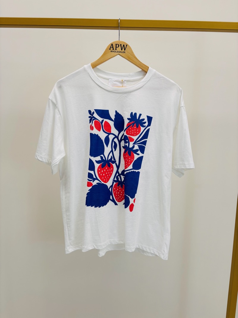 Ce tee-shirt oversize apporte une touche fraîche et artistique à la silhouette. Son imprimé central aux fraises rouges vibrantes et feuillages bleu intense crée un contraste moderne et impactant sur fond blanc lumineux.