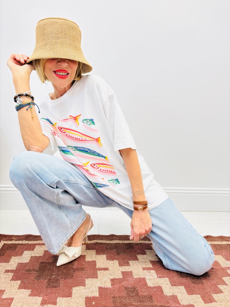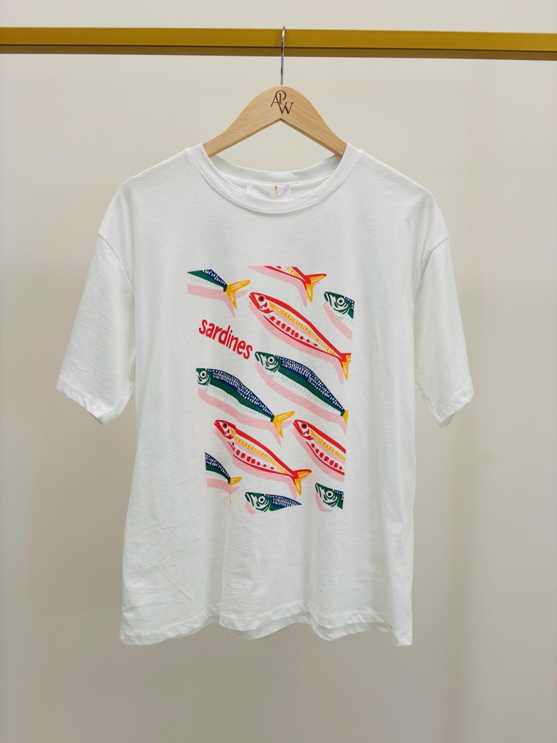 Ce tee-shirt oversize apporte une touche fraîche et estivale à la silhouette grâce à son imprimé coloré inspiré de l’univers marin. Les sardines graphiques aux nuances de rouge, bleu, vert et jaune contrastent parfaitement avec la base blanche lumineuse, créant un visuel fun et tendance.