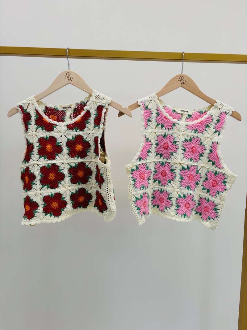 Ce top en crochet incarne parfaitement l’esprit bohème avec son design floral artisanal et ses couleurs vibrantes. Confectionné en 100% coton, il se distingue par ses carrés crochetés ornés de fleurs délicates qui créent un effet graphique et rétro très tendance.