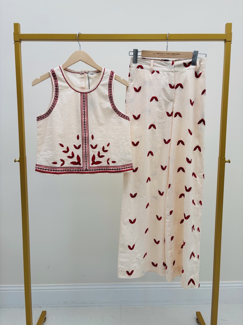 Découvrez un ensemble raffiné avec un top sans manches et un pantalon large. Décoré d’un imprimé délicat, il garantit élégance et confort en toutes occasions.