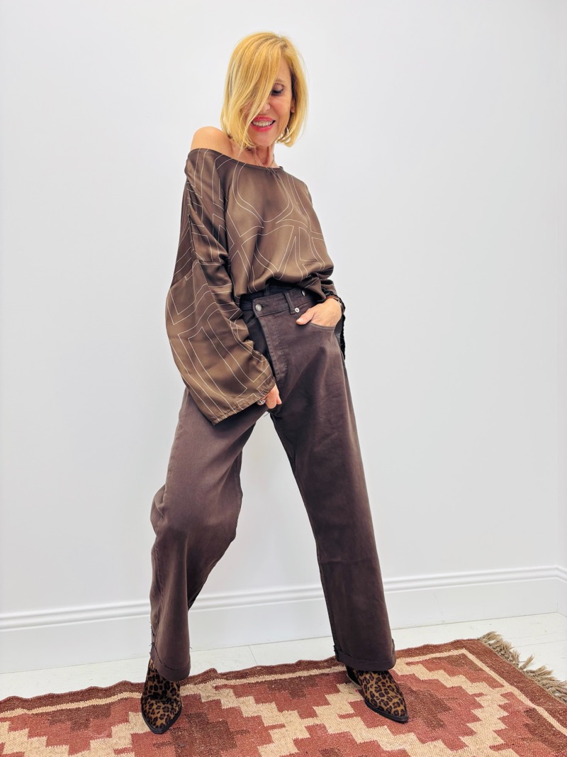 Un top fluide et élégant en satin, idéal pour apporter une touche chic à vos tenues. Sa matière légère et brillante associée à son imprimé graphique lui donnent un style moderne et raffiné.