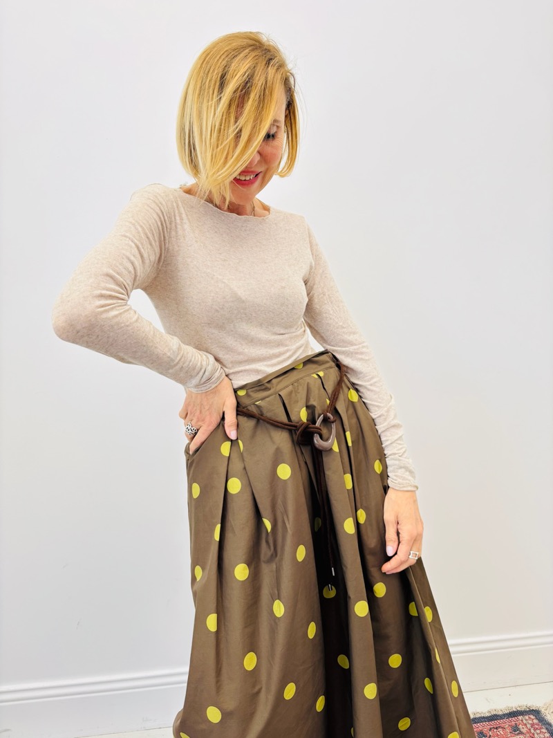 Sous une veste oversize ou un blazer structuré, il devient la base idéale pour un look chic et minimaliste. Associé à un denim ou à une jupe à pois, il permet de calmer un imprimé fort tout en gardant une allure moderne.