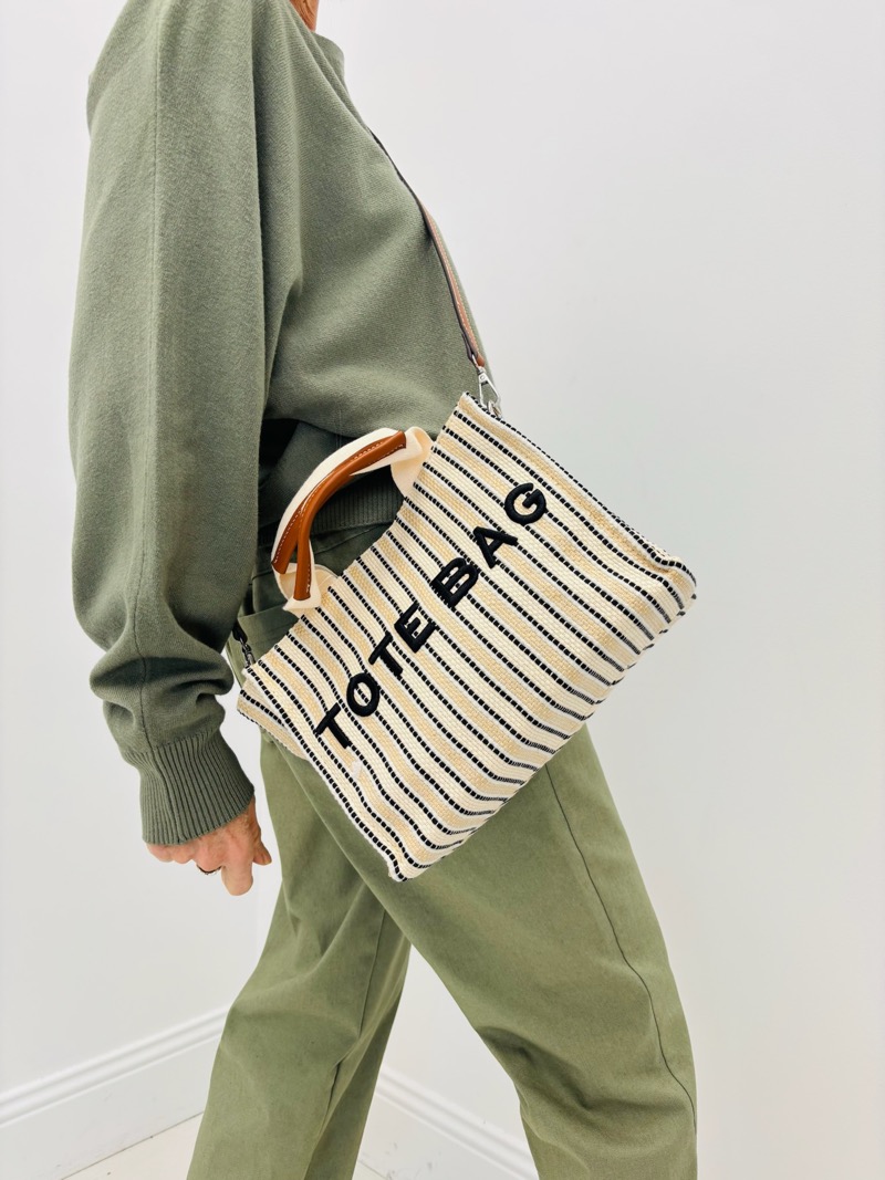Tote Bag Graphique à Rayures et Message Brodé