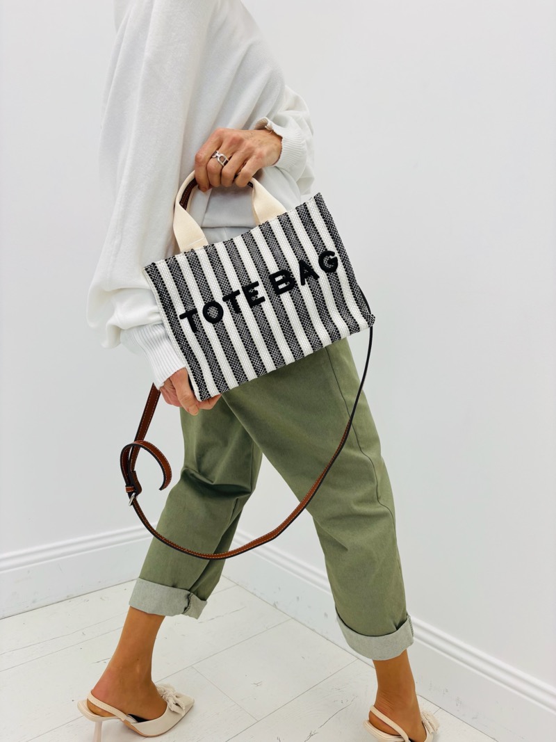 Ce tote bag séduit par son style graphique et contemporain, pensé comme un accessoire mode à part entière. Son design structuré est mis en valeur par de rayures contrastées et un message brodé affirmé, apportant une touche moderne, tendance et légèrement décalée à toutes les silhouettes.