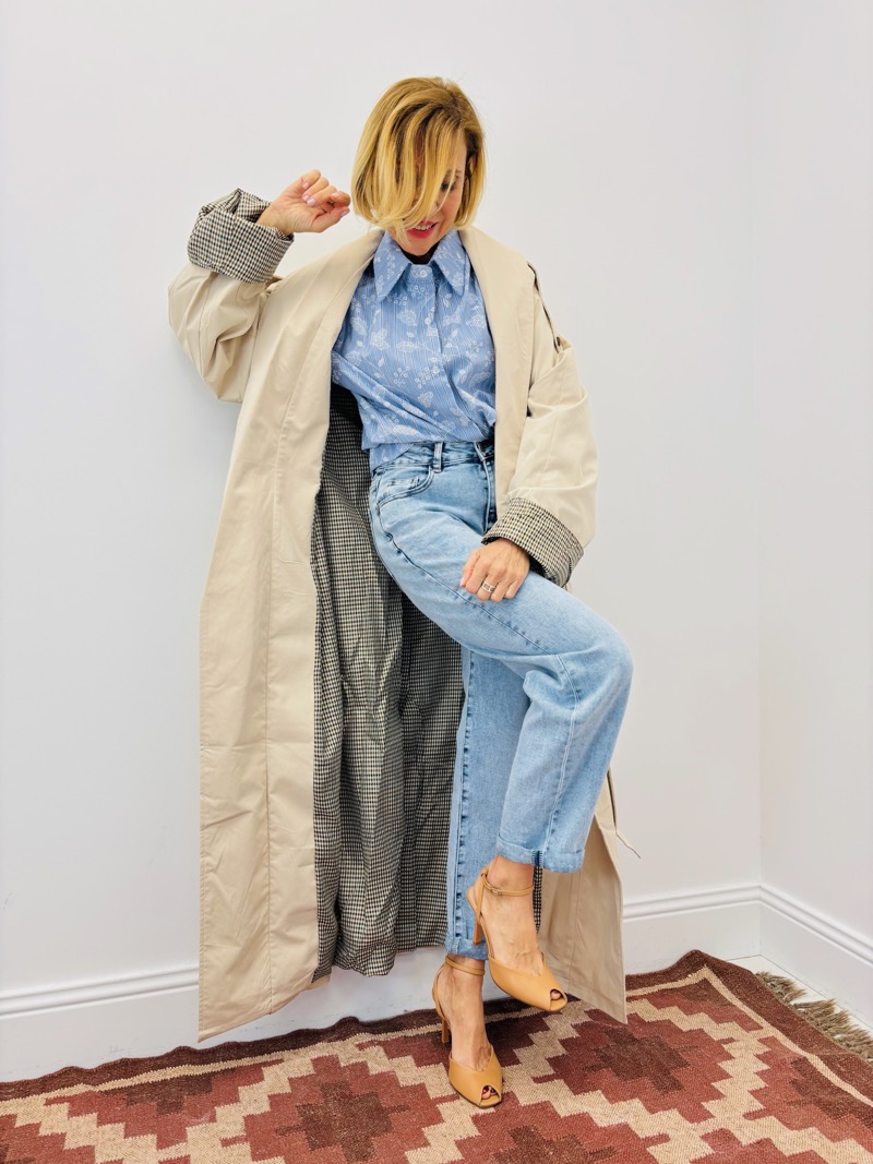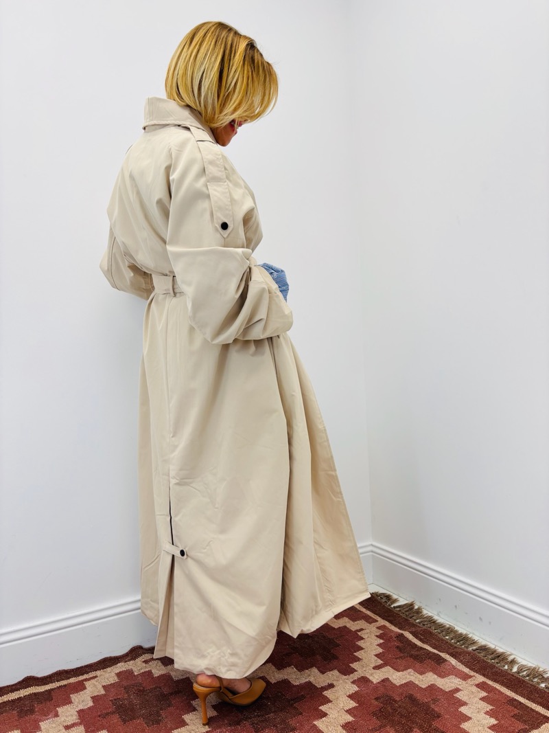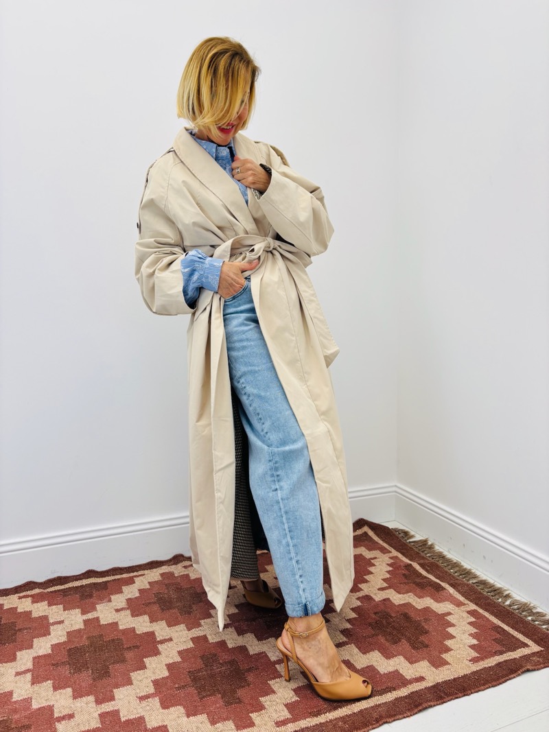 Ce trench sublime un jean taille haute et une chemise pour un look parisien moderne. Porté ouvert, il apporte mouvement et légèreté ; ceinturé, il crée une silhouette élégante et maîtrisée.