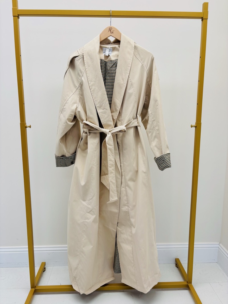 Trench Long Détail Vichy Coupe Élégante Ceinturée