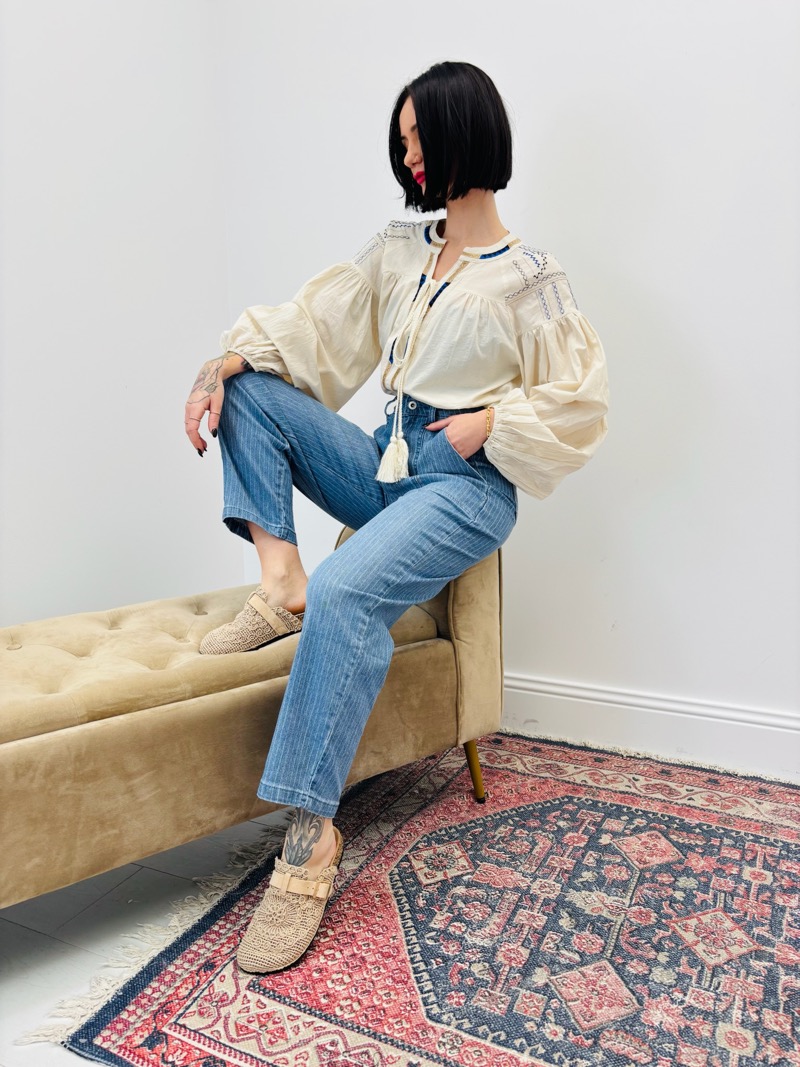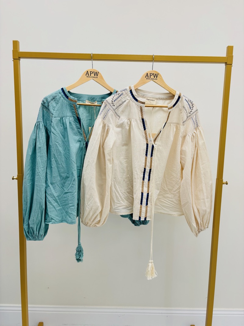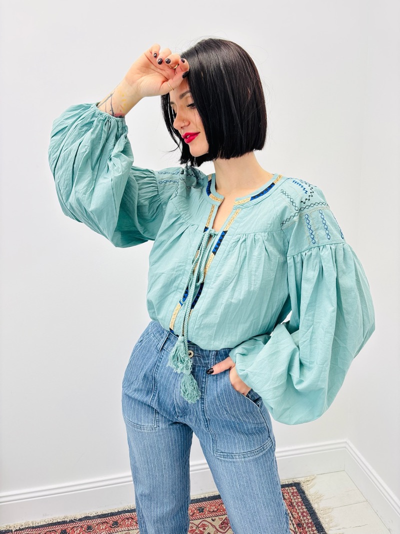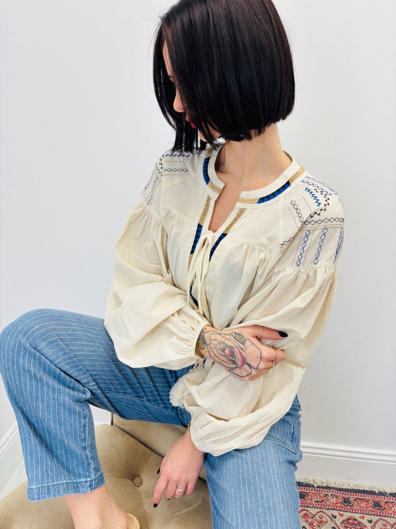 Le détail signature réside dans ses broderies délicates au niveau de l’encolure et des épaules, associées à une patte de boutonnage décorative et à un cordon à nouer avec pompons. Ces finitions apportent une vraie valeur ajoutée et renforcent l’esprit bohème et artisanal de la tunique. Les manches longues bouffantes, resserrées aux poignets, donnent une allure élégante et féminine tout en restant confortables.