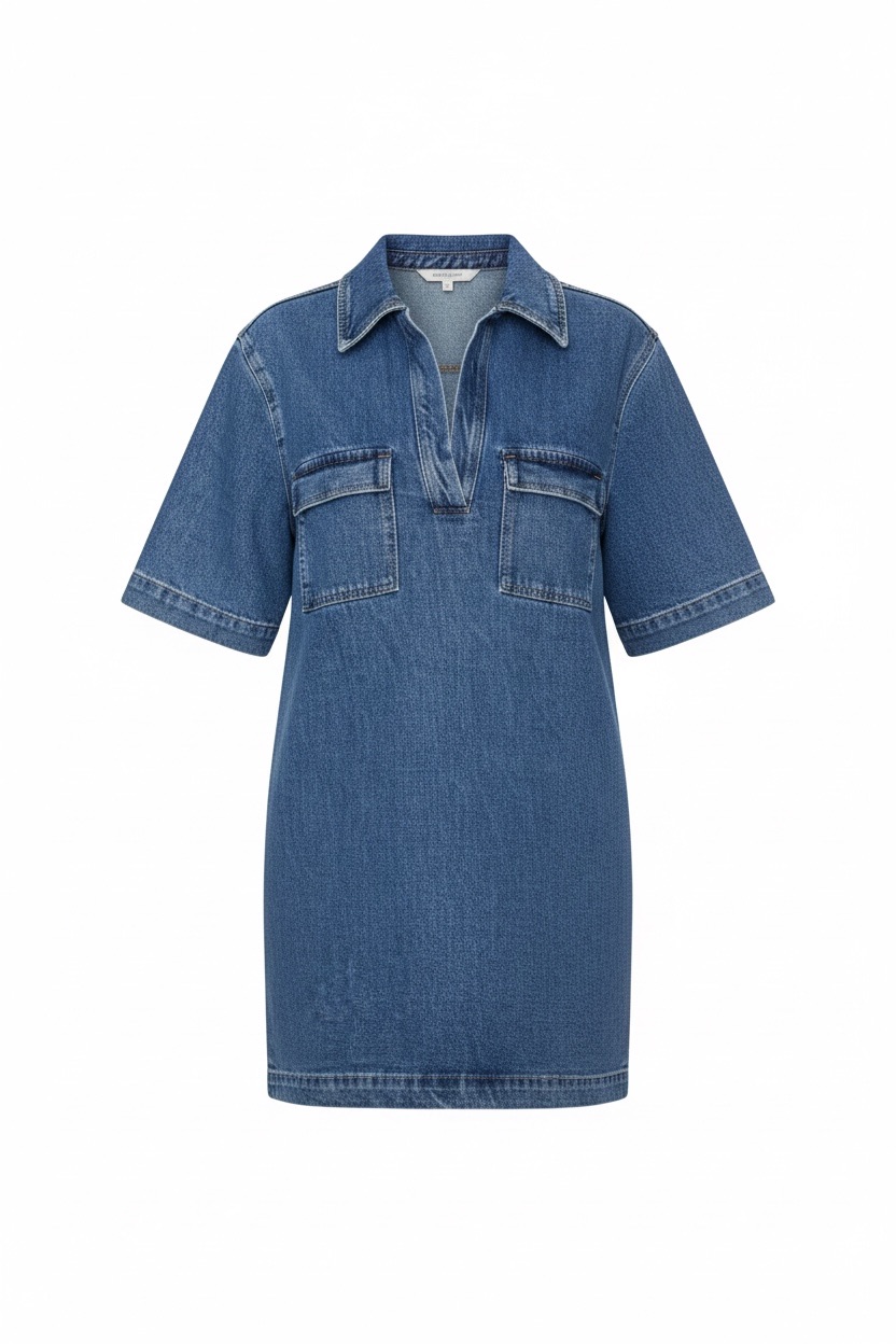 Le modèle se distingue par son col chemise ouvert avec encolure en V, qui allonge visuellement le buste et apporte une touche féminine. Les deux poches poitrine plaquées renforcent l’esprit denim authentique tout en ajoutant un détail pratique et esthétique. Les manches courtes larges, avec finition nette, donnent à la pièce un style casual assumé, idéal pour la mi-saison ou l’été.