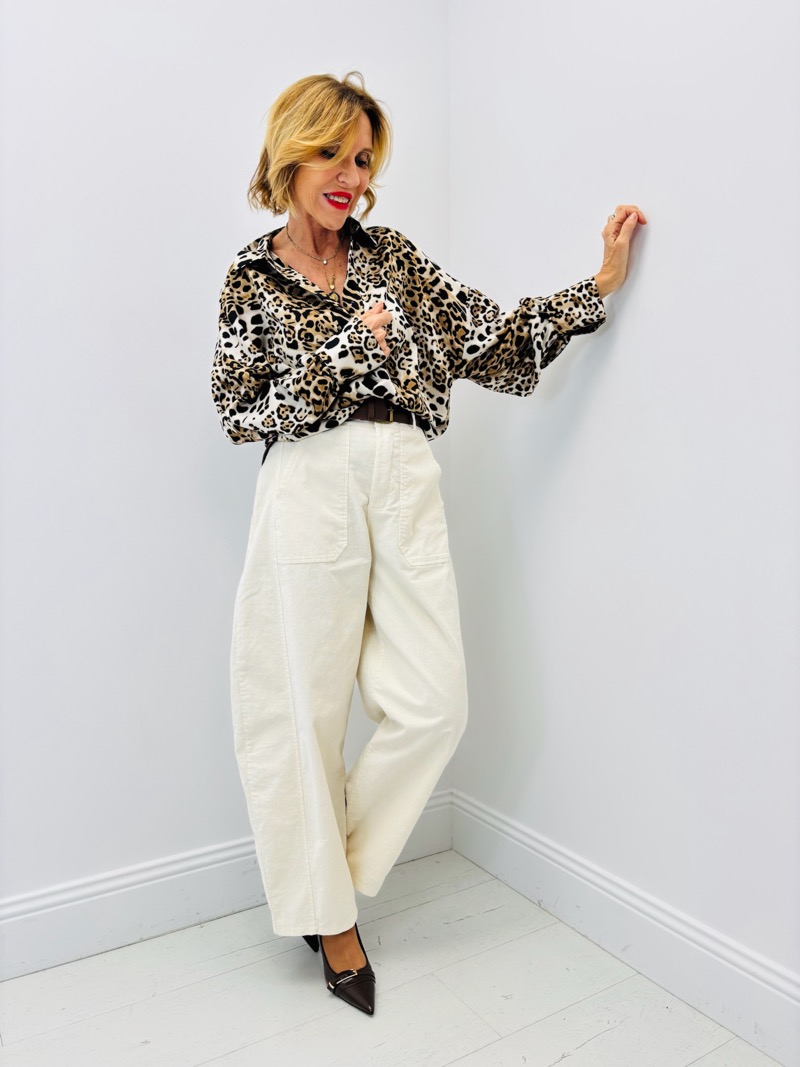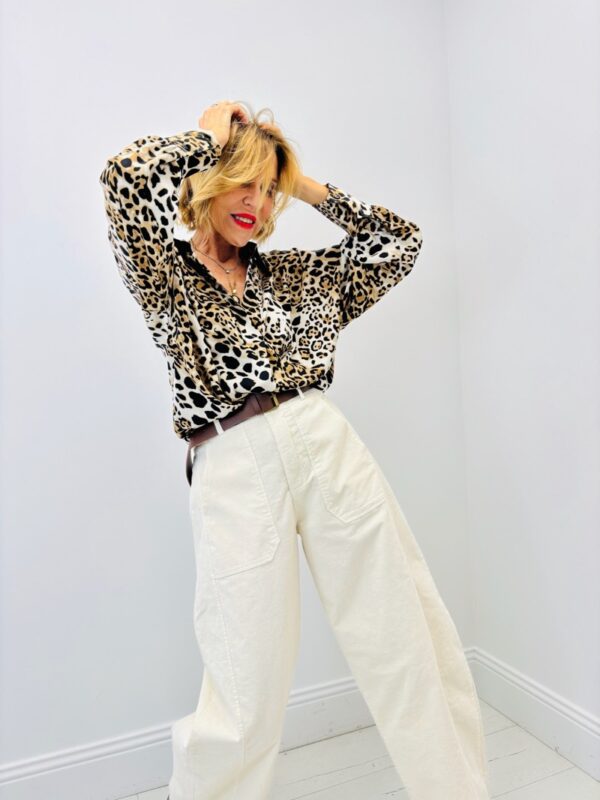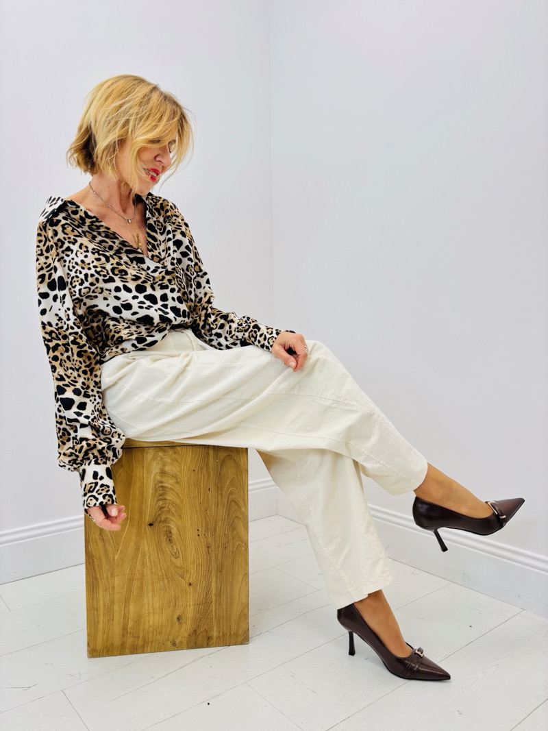 Sur les photos, la tunique léopard est portée rentrée dans un pantalon large écru pour un look moderne, lumineux et très raffiné.
