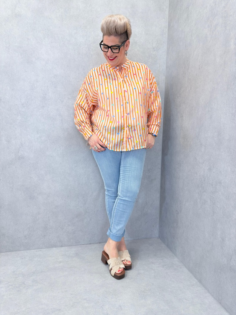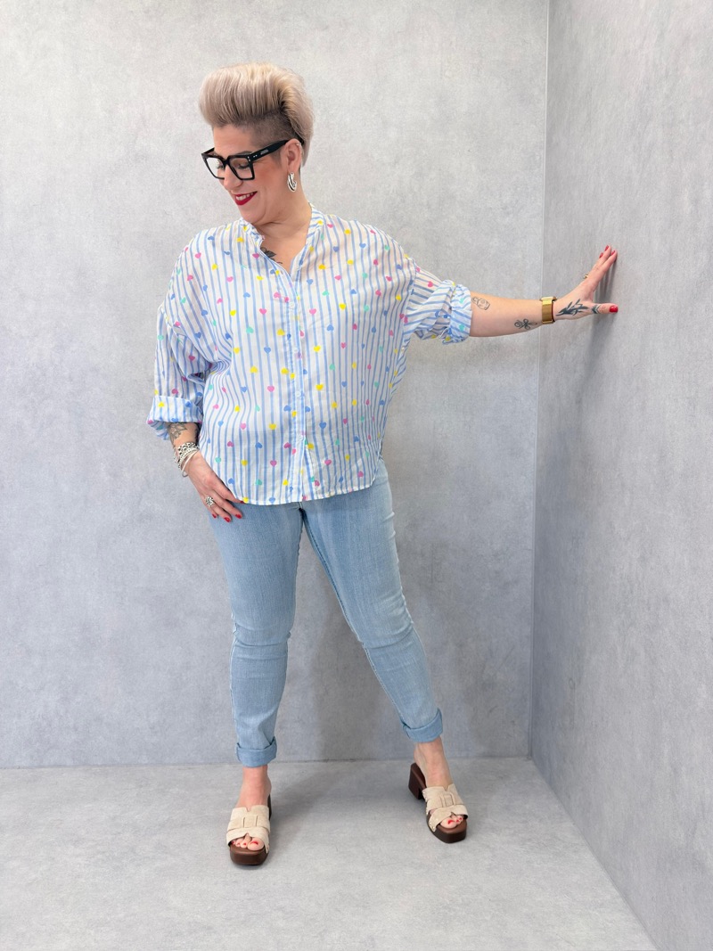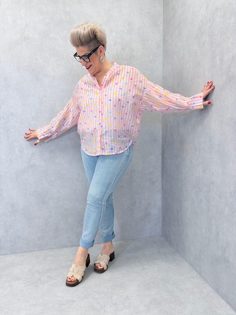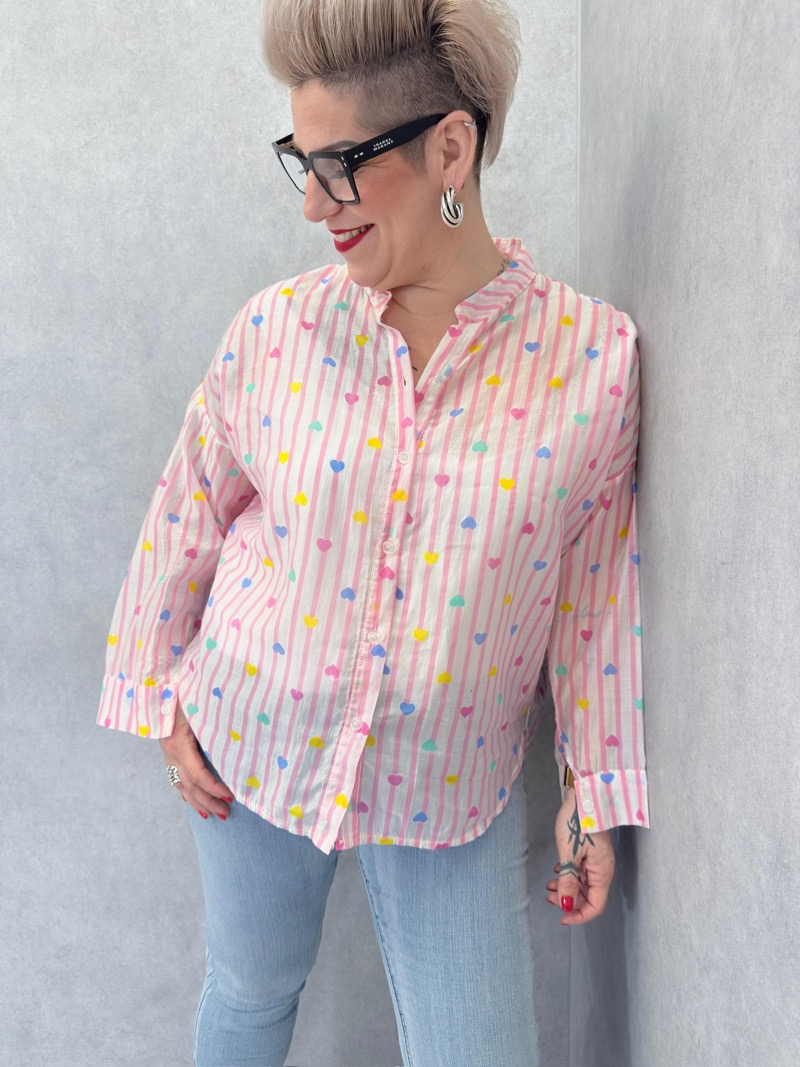 Cette tunique légère séduit par son style frais et coloré qui apporte immédiatement une touche de bonne humeur à la silhouette. Son motif rayé associé à de petits cœurs multicolores crée un look à la fois moderne, ludique et très tendance.