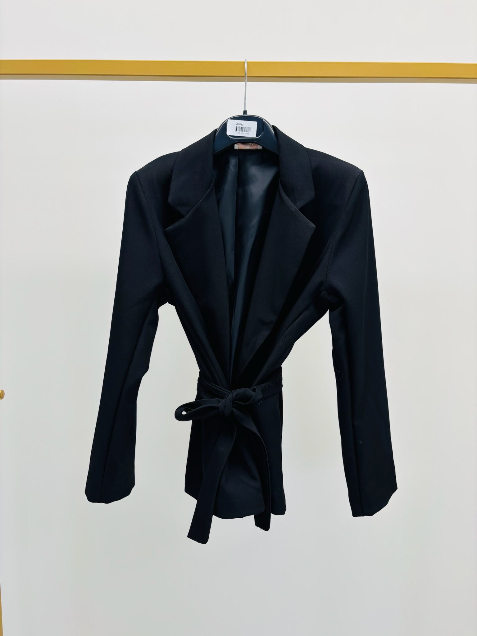 Un classique du vestiaire revisité avec raffinement. Cette veste blazer à la coupe fluide souligne la taille grâce à sa ceinture à nouer, apportant structure et féminité à la silhouette.