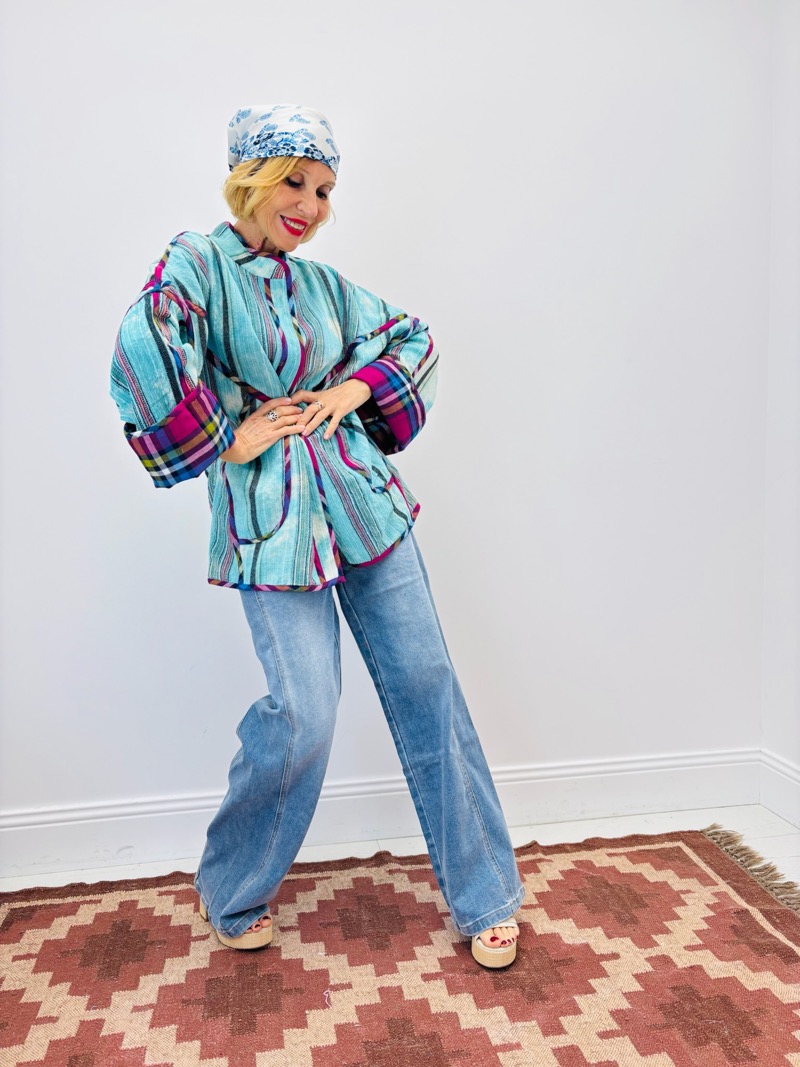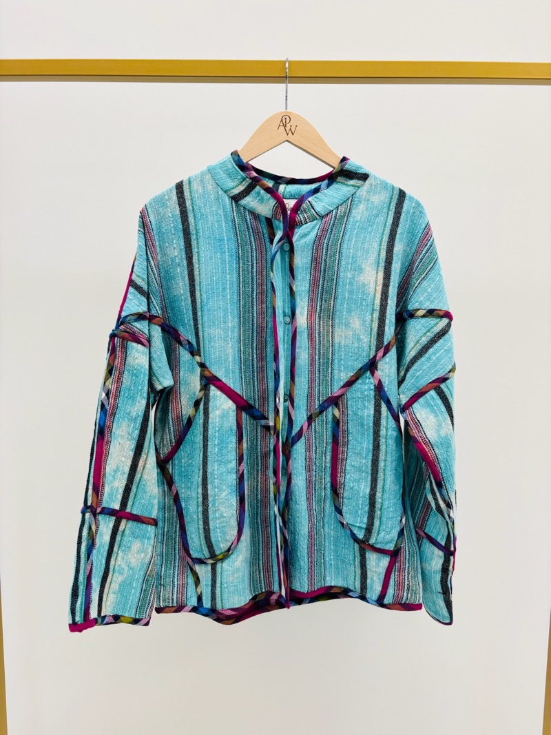 Pièce forte et ultra tendance, la veste BRYTE signée Gold&Silver revisite la toile de jean dans un esprit bohème chic assumé. Avec son jeu de rayures verticales turquoise, noir et nuances subtiles, elle apporte immédiatement du caractère à une silhouette tout en restant facile à associer.