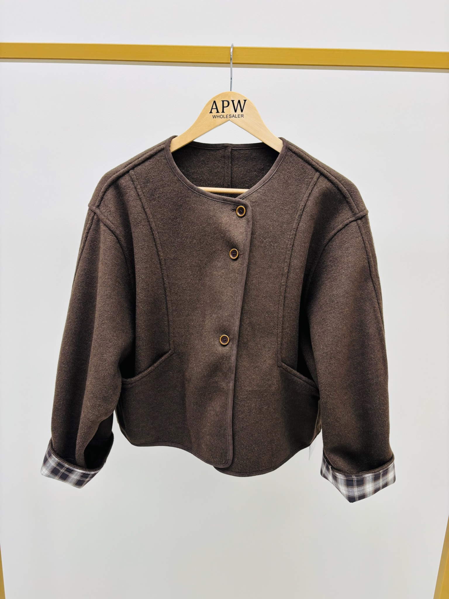 Les finitions soignées et les revers de manches à carreaux ajoutent une touche d’élégance discrète.