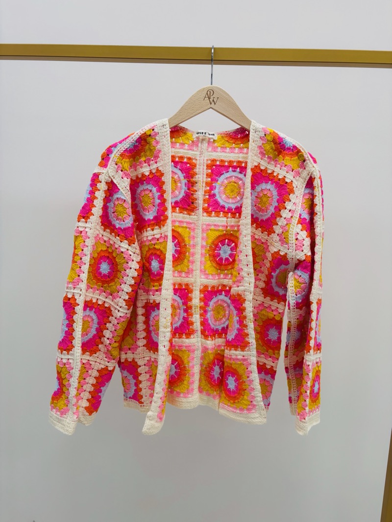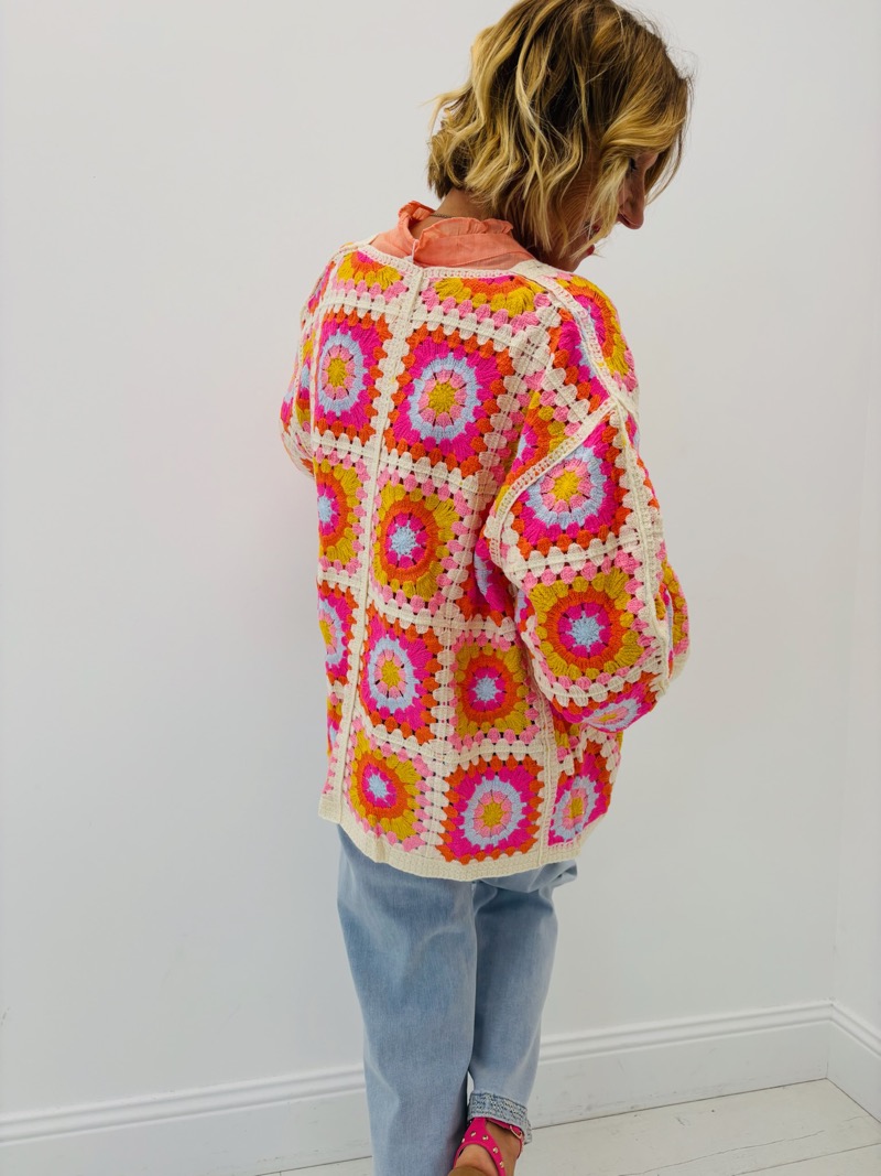 Confectionnée dans une maille crochetée au style fait main, cette veste se distingue par ses carrés assemblés en patchwork formant de magnifiques rosaces colorées. Les nuances de rose, fuchsia, orange, jaune et écru créent une palette vibrante et solaire qui attire immédiatement le regard.
