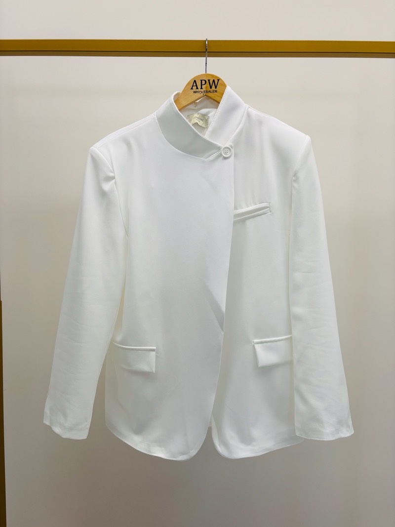 Cette veste élégante revisite les codes du blazer classique avec une coupe moderne et un boutonnage décalé original qui apporte une touche contemporaine à la silhouette. Son col montant structuré lui confère une allure sophistiquée et minimaliste, idéale pour composer des looks à la fois chic et modernes.