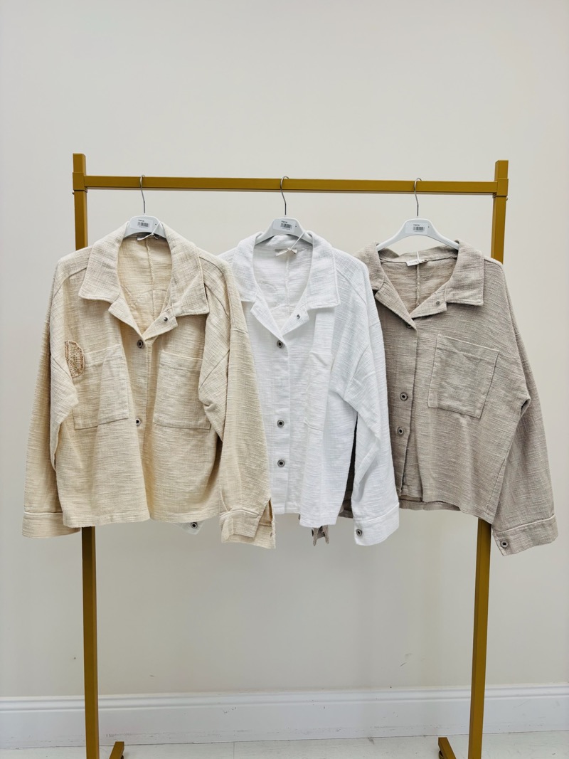 Disponible dans des teintes neutres et faciles à associer (blanc lumineux, beige naturel, taupe doux), cette veste s’intègre parfaitement dans une collection printemps/été ou mi-saison.