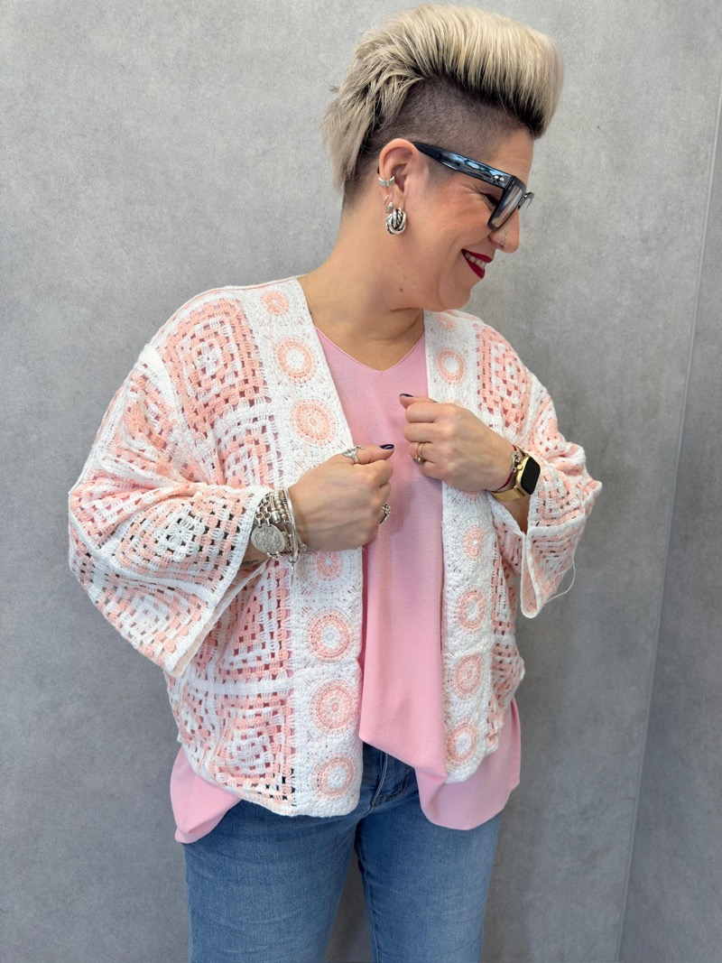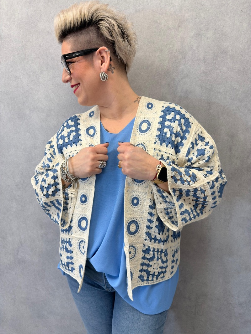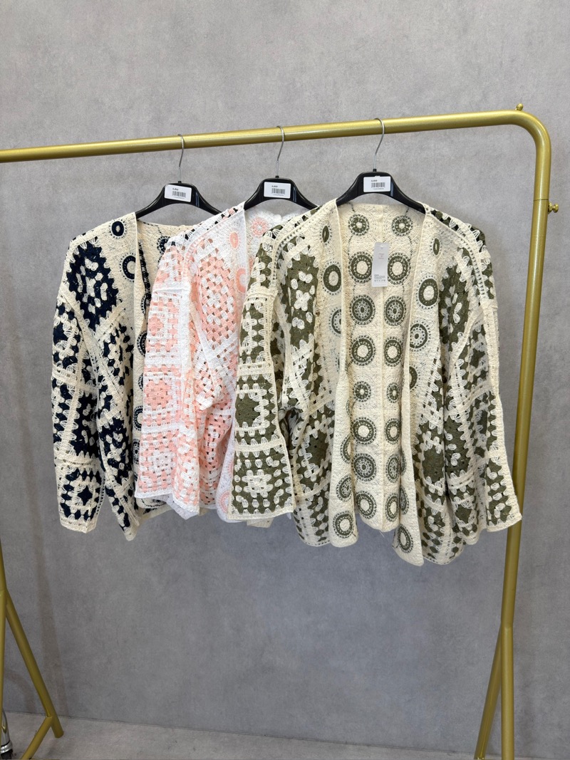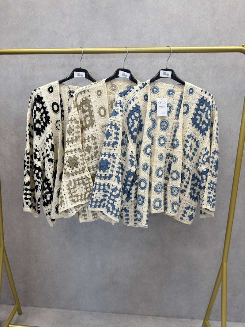 Portée sur un t-shirt, une blouse ou une robe, cette veste en crochet apporte immédiatement une touche bohème chic à la silhouette. Elle se marie parfaitement avec un jean, un pantalon fluide ou une jupe pour créer des looks estivaux élégants et naturels. Une pièce idéale pour enrichir une tenue sans effort et capter l’attention en vitrine comme en cabine.