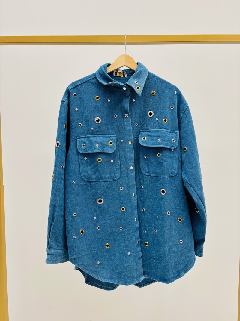 Son véritable atout réside dans le travail des rivets et œillets métalliques répartis sur l’ensemble du modèle. Mélange de finitions argentées et dorées, ces détails apportent du relief et un esprit mode affirmé. Ce contraste subtil entre denim brut et touches métalliques donne à la pièce une identité forte, idéale pour dynamiser une silhouette.