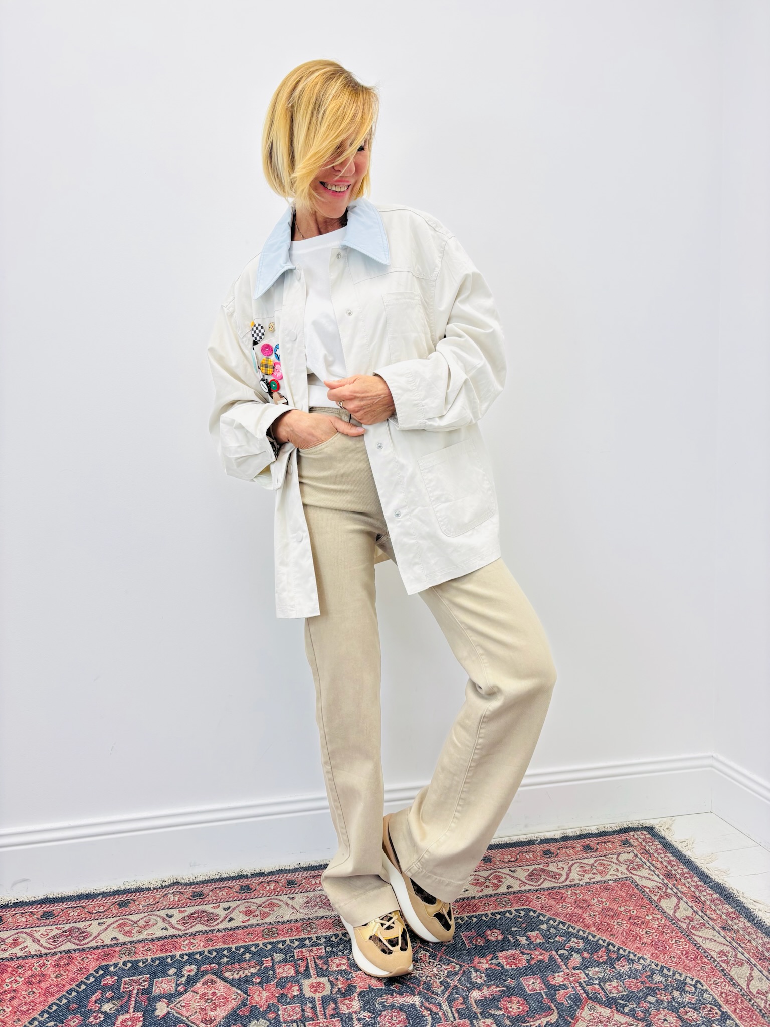 Les pin’s multicolores, positionnés sur le devant, créent un contraste visuel fort et donnent à chaque veste une personnalité unique. Le col contrasté ajoute une finition raffinée et accentue l’identité mode du modèle. C’est une pièce forte, parfaite pour dynamiser une sélection vestes en boutique et séduire une clientèle en quête d’originalité.