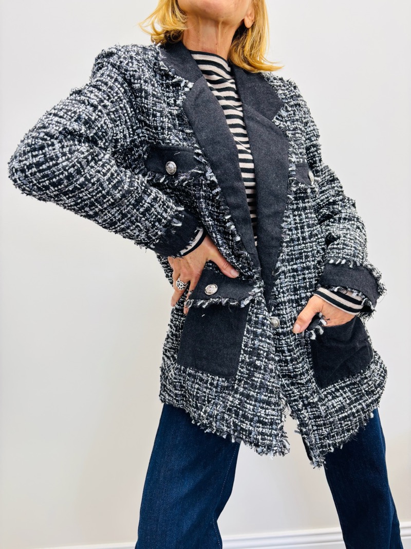 Une veste élégante et structurée en tweed, parfaite pour ajouter une touche chic à vos looks. Ses détails contrastés et ses finitions travaillées en font une pièce mode incontournable.