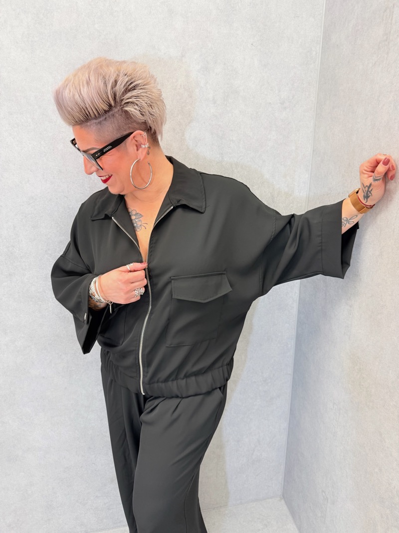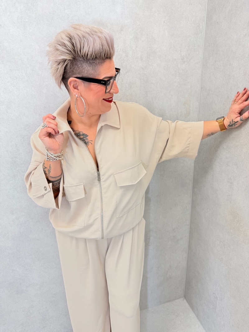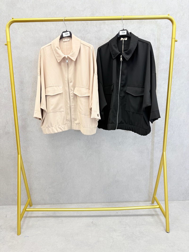 La fermeture zippée sur le devant apporte une touche pratique et contemporaine, permettant de porter la veste ouverte ou fermée selon le style recherché. Le col chemise, sobre et élégant, structure le haut du buste et renforce l’aspect chic de la pièce. Les poches plaquées à l’avant, à la fois décoratives et fonctionnelles, ajoutent un esprit utilitaire très tendance. Les manches, confortables et bien proportionnées, peuvent être portées telles quelles ou légèrement retroussées pour un look plus décontracté.