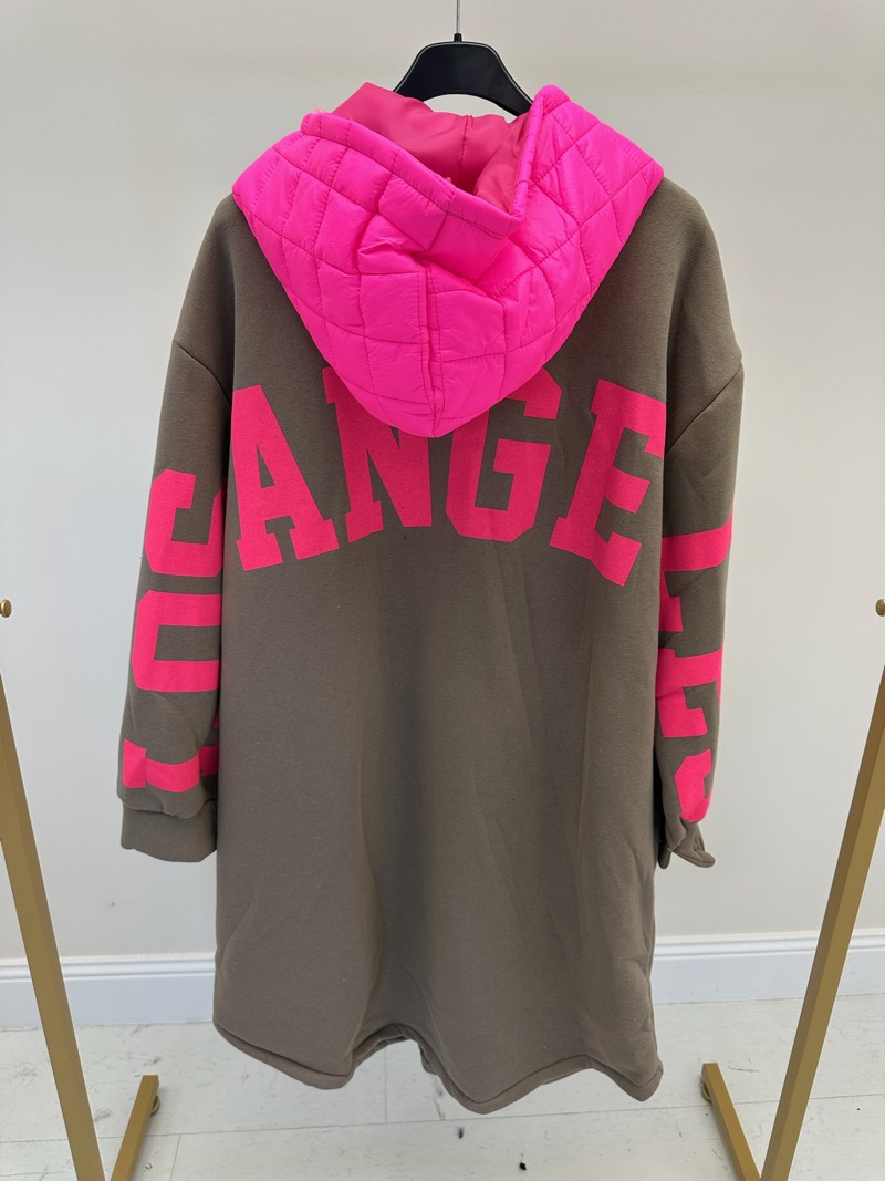 Veste longue grande taille taupe à capuche fuchsia – Esprit urbain et décontracté