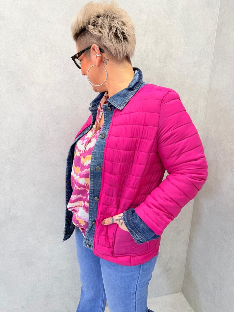 Le matelassage léger permet de rester bien au chaud tout en conservant une sensation de légèreté, ce qui rend cette veste parfaite pour la mi-saison, l’automne ou les journées fraîches du printemps. La matière est agréable à porter, souple et confortable, idéale pour un usage quotidien. Le col chemise en denim structure le haut du buste et met en valeur le port de tête, tandis que la fermeture boutonnée sur le devant apporte une finition soignée et pratique.